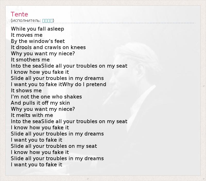 While you fall asleep It moves me By the window's feet It drools and crawls on knees Why you want my niece? It smothers me Into the seaSlide all your troubles on my seat I know how you fake it Slide all your troubles in my dreams I want you to fake itWhy do I pretend It shows me I'm not the one who shakes And pulls it off my skin Why you want my niece? It melts with me Into the seaSlide all your troubles on my seat I know how you fake it Slide all your troubles in my dreams I want you to fake it Slide all your troubles on my seat I know how you fake it Slide all your troubles in my dreams I want you to fake it