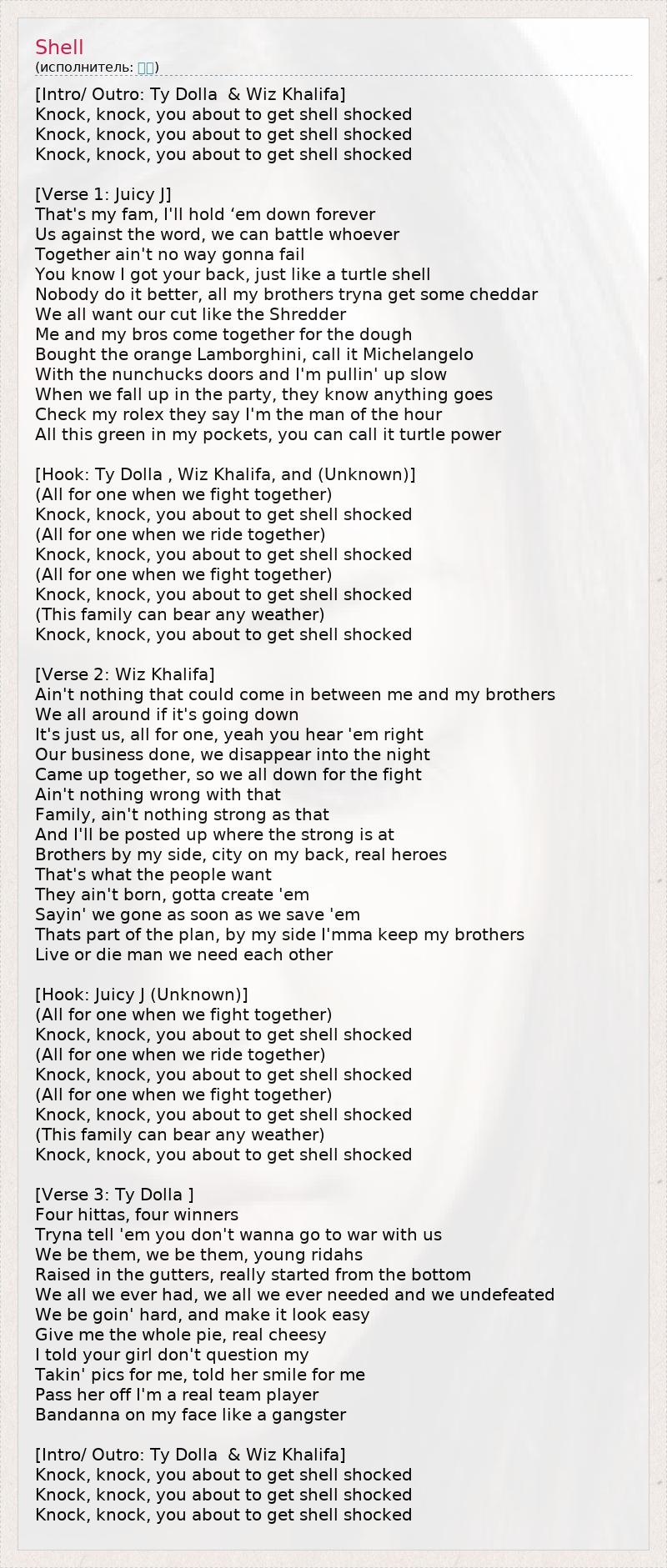 [Вступление/Концовка: Ty Dolla ] Удар, ещё один - и вот тебе почти сотрясение панциря. 1 Удар, ещё один - и вот тебе почти сотрясение панциря. Удар, ещё один - и вот тебе почти сотрясение панциря. [Куплет 1: Juicy J] Вот мои кенты, я с ними буду до конца. Мы против всего мира, можем побороть любого. Когда мы вместе, нет места неудачам. Ты знаешь, что я прикрываю тебя, как панцирь черепахи. Нет никого лучше нас, все мои братки пытаются отхватить немного золотого сыра. 2 Все мы хотим денег, так же как хочет порезать всех Шредер. 3 Вместе с братвой я пришел за капустой. 4 Купил оранжевый Ламборджини, зови его Микеланджело С нунчаки-дверями, 5 медленно на нем подъезжаю, Когда появляюсь на вечеринке, все в курсе. Глядя на свои Ролексы, говорят, я начинаю заводить. 6 Всю эту зелень в моих карманах, можешь называть силой черепахи. [Припев: Ty Dolla & Wiz Khalifa] (Один за всех и все за одного, когда время биться) Удар, ещё один - и вот тебе почти сотрясение панциря. (Мы пишемся друг за друга, когда гоняем вместе) Удар, ещё один - и вот тебе почти сотрясение панциря. (Один за всех и все за одного, когда время биться) Удар, ещё один - и вот тебе почти сотрясение панциря. (Наша братва может выдержать любое испытание) Удар, ещё один - и вот тебе почти сотрясение панциря. [Куплет 2: Wiz Khalifa] Ничто не может стать между мной и моими братками. Мы везде, если начинается движуха. Просто мы стоим, друг за друга, точняк, тебе не послышалось. Закончив дела, скрываемся под покровом ночи. Мы вместе с самого начала, поэтому все вместе идем в бой. Нет ни единого сомнения, что Семья – великая сила. Мой плакат будет висеть среди сильнейших. Братья со мной, город за спиной, мы прям настоящие герои. Вот, кто нужен людям. Они не рождаются, значит, мы должны их создать. Говоря, что мы исчезнем, вскоре спася жизни, Мы соблюдаем план, 7 мои братки будут всегда рядом. Мы нужны друг другу, чего бы это ни стоило. 8 [Припев: Ty Dolla & Wiz Khalifa] (Один за всех и все за одного, когда время биться) Удар, ещё один - и вот тебе почти сотрясение панциря. (Мы пишемся друг за друга, когда гоняем вместе) Удар, ещё один - и вот тебе почти сотрясение панциря. (Один за всех и все за одного, когда время биться) Удар, ещё один - и вот тебе почти сотрясение панциря. (Наша братва может выдержать любое испытание) Удар, ещё один - и вот тебе почти сотрясение панциря. [Куплет 3: Ty Dolla ] Четыре палача, четыре чемпиона. Пытаюсь предупредить вас, не тягаться с нами. Мы они, мы они, юные налётчики. 9 Выросли в трущобах, в натуре, с нуля добились всего сами. Мы – все, что у нас есть, мы – все, что нам необходимо и мы непобедимы. Мы не жалеем сил, но нам все легко дается. 10 Отдайте мне весь куш, словно пирог, напичканный сыром. 11 Я сказал твоей девахе, задавать поменьше вопросов и просто Сфоткайся для меня, посияй улыбкой. Передал ее, как настоящий командный игрок. 12 Бандана на лице, я похож бандита. [Вступление/Концовка: Ty Dolla ] Удар, ещё один - и вот тебе почти сотрясение панциря. Удар, ещё один - и вот тебе почти сотрясение панциря. Удар, ещё один - и вот тебе почти сотрясение панциря. 1 - вообще, shell-shocked означает "контуженный, испытывающий шок от контузии". Но поскольку песня о черепашках-ниндзя, так и напрашивается дословный перевод, особенно первой части этого сложного существительного (shell = "панцирь") 2 – Игра слов. cheddar – сорт сыра, но на сленге – деньги. Также, учитывая то, что песня является саундтреко