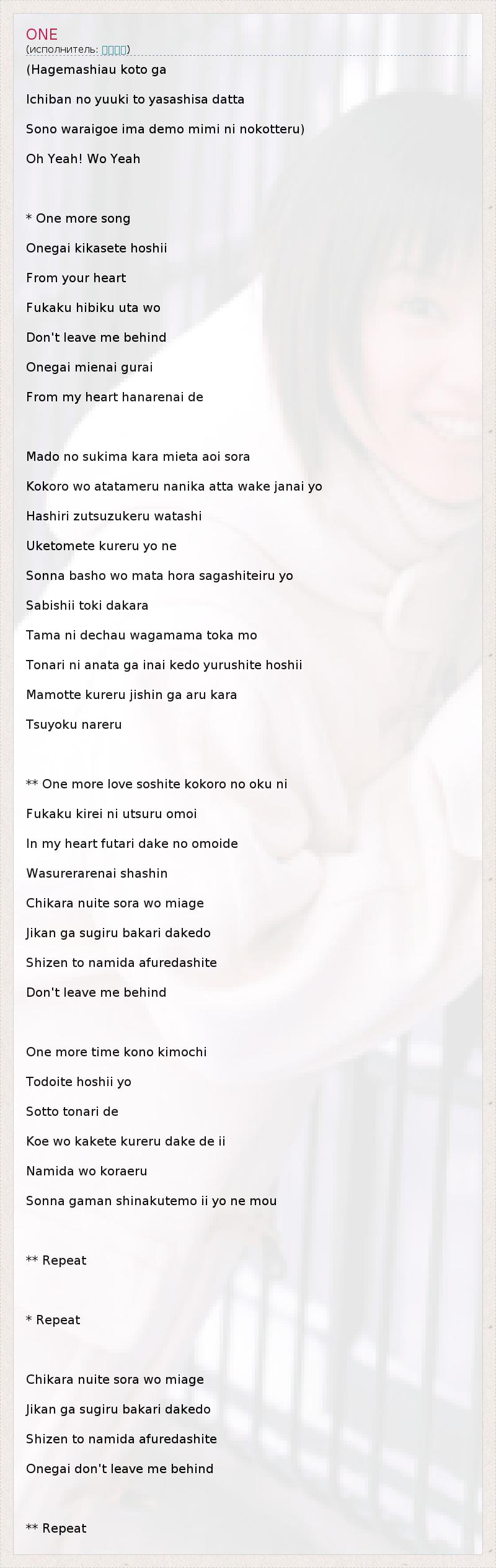(Hagemashiau koto ga Ichiban no yuuki to yasashisa datta Sono waraigoe ima demo mimi ni nokotteru) Oh Yeah! Wo Yeah * One more song Onegai kikasete hoshii From your heart Fukaku hibiku uta wo Don't leave me behind Onegai mienai gurai From my heart hanarenai de Mado no sukima kara mieta aoi sora Kokoro wo atatameru nanika atta wake janai yo Hashiri zutsuzukeru watashi Uketomete kureru yo ne Sonna basho wo mata hora sagashiteiru yo Sabishii toki dakara Tama ni dechau wagamama toka mo Tonari ni anata ga inai kedo yurushite hoshii Mamotte kureru jishin ga aru kara Tsuyoku nareru ** One more love soshite kokoro no oku ni Fukaku kirei ni utsuru omoi In my heart futari dake no omoide Wasurerarenai shashin Chikara nuite sora wo miage Jikan ga sugiru bakari dakedo Shizen to namida afuredashite Don't leave me behind One more time kono kimochi Todoite hoshii yo Sotto tonari de Koe wo kakete kureru dake de ii Namida wo koraeru Sonna gaman shinakutemo ii yo ne mou ** Repeat * Repeat Chikara nuite sora wo miage Jikan ga sugiru bakari dakedo Shizen to namida afuredashite Onegai don't leave me behind ** Repeat