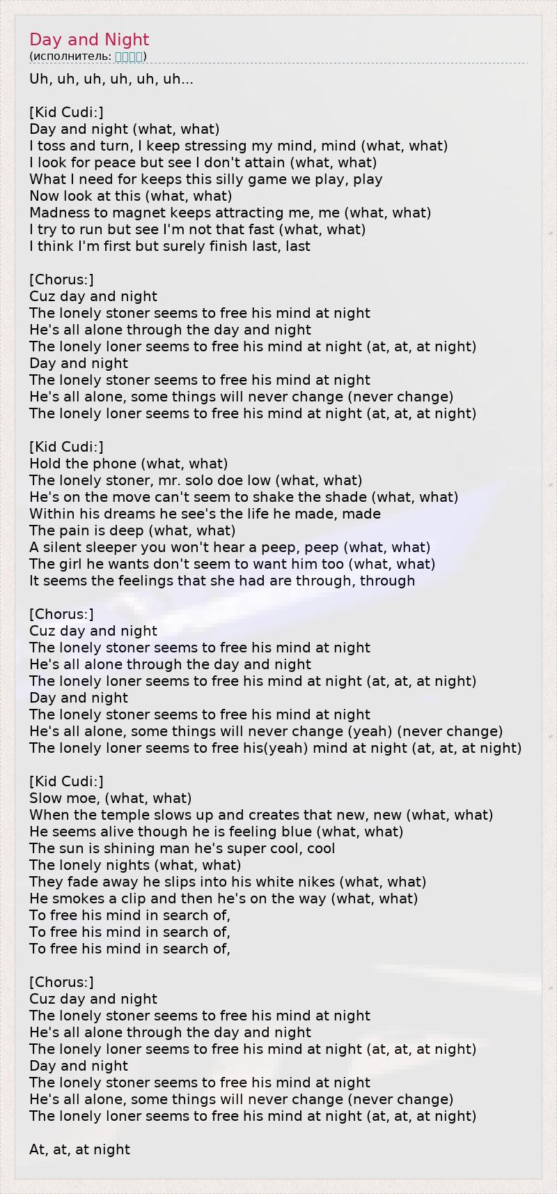 Uh, uh, uh, uh, uh, uh... [Kid Cudi:] Day and night (what, what) I toss and turn, I keep stressing my mind, mind (what, what) I look for peace but see I don't attain (what, what) What I need for keeps this silly game we play, play Now look at this (what, what) Madness to magnet keeps attracting me, me (what, what) I try to run but see I'm not that fast (what, what) I think I'm first but surely finish last, last [Chorus:] Cuz day and night The lonely stoner seems to free his mind at night He's all alone through the day and night The lonely loner seems to free his mind at night (at, at, at night) Day and night The lonely stoner seems to free his mind at night He's all alone, some things will never change (never change) The lonely loner seems to free his mind at night (at, at, at night) [Kid Cudi:] Hold the phone (what, what) The lonely stoner, mr. solo doe low (what, what) He's on the move can't seem to shake the shade (what, what) Within his dreams he see's the life he made, made The pain is deep (what, what) A silent sleeper you won't hear a peep, peep (what, what) The girl he wants don't seem to want him too (what, what) It seems the feelings that she had are through, through [Chorus:] Cuz day and night The lonely stoner seems to free his mind at night He's all alone through the day and night The lonely loner seems to free his mind at night (at, at, at night) Day and night The lonely stoner seems to free his mind at night He's all alone, some things will never change (yeah) (never change) The lonely loner seems to free his(yeah) mind at night (at, at, at night) [Kid Cudi:] Slow moe, (what, what) When the temple slows up and creates that new, new (what, what) He seems alive though he is feeling blue (what, what) The sun is shining man he's super cool, cool The lonely nights (what, what) They fade away he slips into his white nikes (what, what) He smokes a clip and then he's on the way (what, what) To free his mind in search of, To free his mind in search of, To free his mind in search of, [Chorus:] Cuz day and night The lonely stoner seems to free his mind at night He's all alone through the day and night The lonely loner seems to free his mind at night (at, at, at night) Day and night The lonely stoner seems to free his mind at night He's all alone, some things will never change (never change) The lonely loner seems to free his mind at night (at, at, at night) At, at, at night