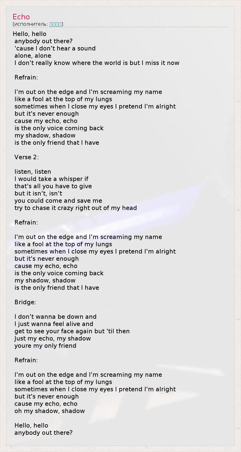 Hello, hello anybody out there? 'cause I don't hear a sound alone, alone I don't really know where the world is but I miss it now Refrain: I'm out on the edge and I'm screaming my name like a fool at the top of my lungs sometimes when I close my eyes I pretend I'm alright but it's never enough cause my echo, echo is the only voice coming back my shadow, shadow is the only friend that I have Verse 2: listen, listen I would take a whisper if that's all you have to give but it isn't, isn't you could come and save me try to chase it crazy right out of my head Refrain: I'm out on the edge and I'm screaming my name like a fool at the top of my lungs sometimes when I close my eyes I pretend I'm alright but it's never enough cause my echo, echo is the only voice coming back my shadow, shadow is the only friend that I have Bridge: I don't wanna be down and I just wanna feel alive and get to see your face again but 'til then Just my echo, my shadow youre my only friend Refrain: I'm out on the edge and I'm screaming my name like a fool at the top of my lungs sometimes when I close my eyes I pretend I'm alright but it's never enough cause my echo, echo oh my shadow, shadow Hello, hello anybody out there?