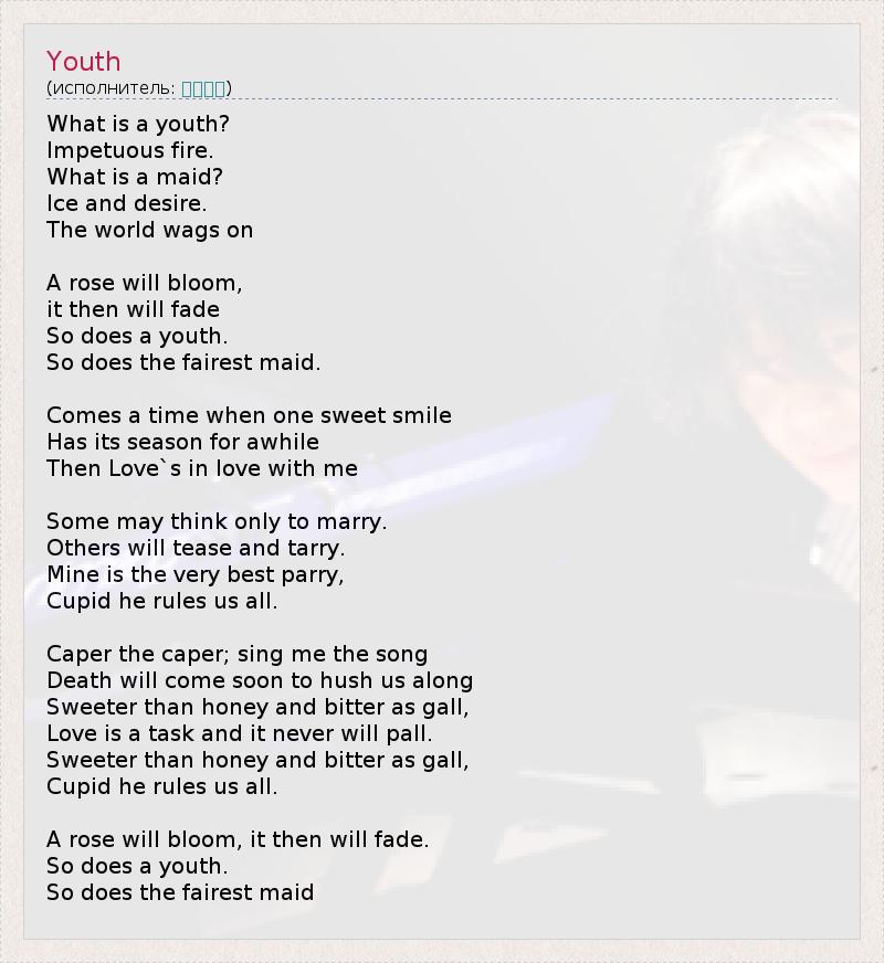 Введите перевод песниЧто есть юнец? Быстрый огонь. Что дева есть? И страсть, и бронь. Жизнь так идет. Роза взойдет. И отцветет. То юношу, То деву прекрасную самую ждет. Грядет час: улыбка враз Отклик вдруг находит в нас. Тогда любовь во мне. Этим бы только жениться, Те будут медлить, дразниться. Мне лучше не объясниться - Всеми рулит купидон. Шутка за шуткой; Тешь меня песней. Смерть придет скоро нас остудить в сон. Слаще, чем мед, но и горче, чем желчь, Скучной любви никогда стать не смочь. Слаще, чем мед, но и горче, чем желчь, - Всеми рулит купидон. Роза взойдет. И отцветет. То юношу, То деву прекрасную самую ждет.