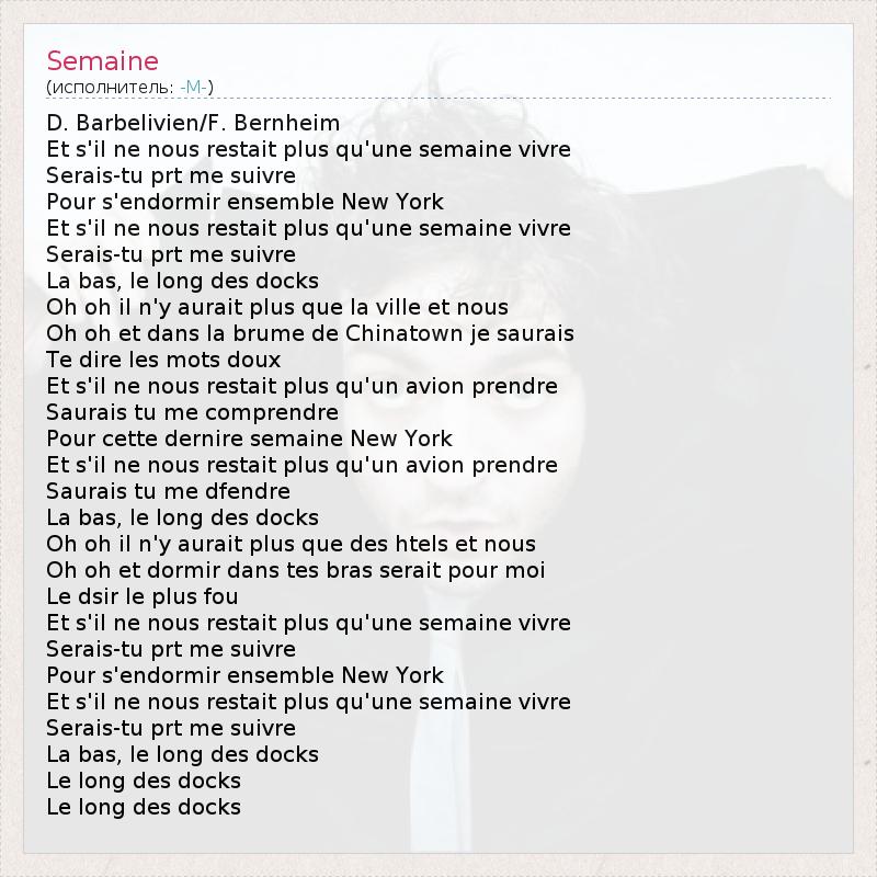 Это интересно:-M- (Mathieu Chedid) сын певца Луи Шедида, внук писательницы Андрэ Шедид. Он родился 21 декабря 1972 года в парижском пригороде Boulogne-Billancourt. Взяв гитару в руки в 15 лет, Матьё становится вскоре музыкантом в студии звукозаписи, где его сразу замечают.На первых порах Матьё нередко выступал на сцене со своим отцом. В состав первых групп Шедида-младшего Золотые Рыбки (Poissons Rouges) и Расплывчатые Детки (Bébés... продолжение