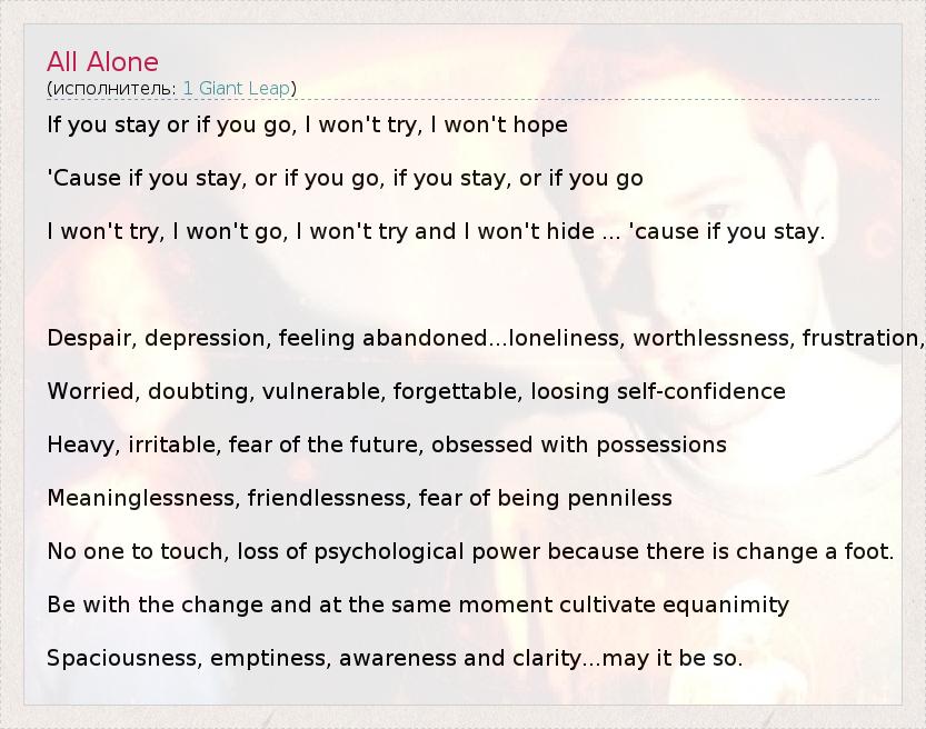 If you stay or if you go, I won't try, I won't hope 'Cause if you stay, or if you go, if you stay, or if you go I won't try, I won't go, I won't try and I won't hide ... 'cause if you stay. Despair, depression, feeling abandoned...loneliness, worthlessness, frustration, Worried, doubting, vulnerable, forgettable, loosing self-confidence Heavy, irritable, fear of the future, obsessed with possessions Meaninglessness, friendlessness, fear of being penniless No one to touch, loss of psychological power because there is change a foot. Be with the change and at the same moment cultivate equanimity Spaciousness, emptiness, awareness and clarity...may it be so.