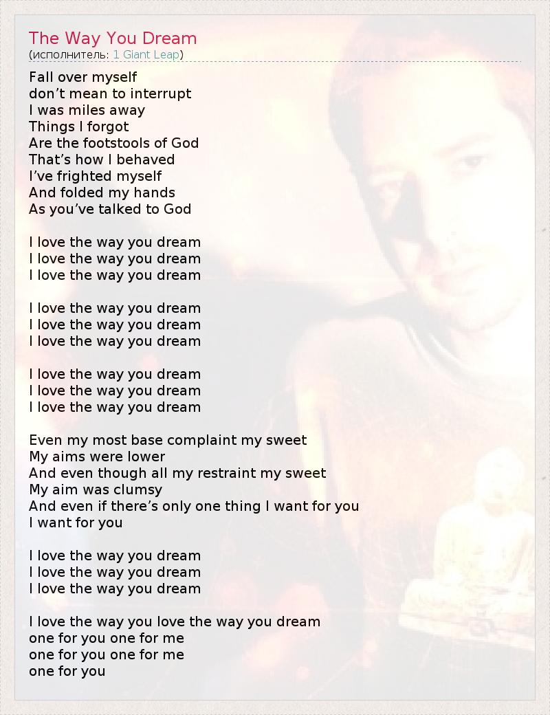 Fall over myself don’t mean to interrupt I was miles away Things I forgot Are the footstools of God That’s how I behaved I’ve frighted myself And folded my hands As you’ve talked to God I love the way you dream I love the way you dream I love the way you dream I love the way you dream I love the way you dream I love the way you dream I love the way you dream I love the way you dream I love the way you dream Even my most base complaint my sweet My aims were lower And even though all my restraint my sweet My aim was clumsy And even if there’s only one thing I want for you I want for you I love the way you dream I love the way you dream I love the way you dream I love the way you love the way you dream one for you one for me one for you one for me one for you