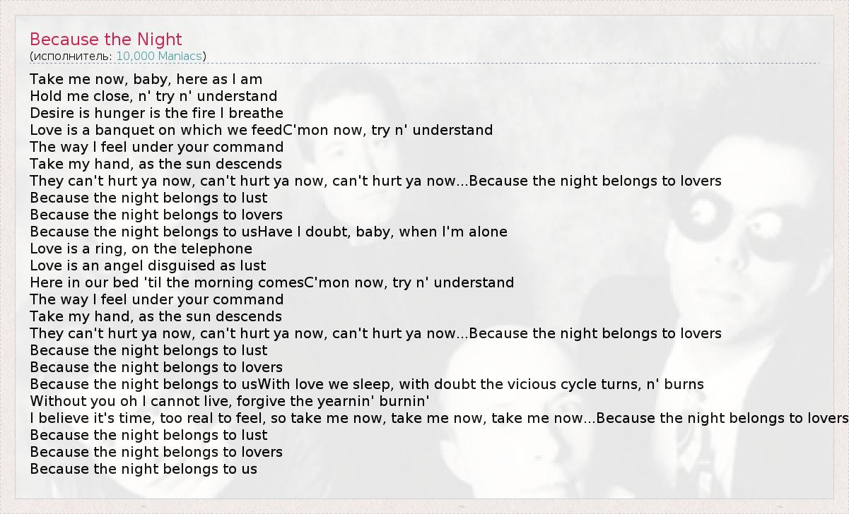 Take me now, baby, here as I am Hold me close, n' try n' understand Desire is hunger is the fire I breathe Love is a banquet on which we feedC'mon now, try n' understand The way I feel under your command Take my hand, as the sun descends They can't hurt ya now, can't hurt ya now, can't hurt ya now...Because the night belongs to lovers Because the night belongs to lust Because the night belongs to lovers Because the night belongs to usHave I doubt, baby, when I'm alone Love is a ring, on the telephone Love is an angel disguised as lust Here in our bed 'til the morning comesC'mon now, try n' understand The way I feel under your command Take my hand, as the sun descends They can't hurt ya now, can't hurt ya now, can't hurt ya now...Because the night belongs to lovers Because the night belongs to lust Because the night belongs to lovers Because the night belongs to usWith love we sleep, with doubt the vicious cycle turns, n' burns Without you oh I cannot live, forgive the yearnin' burnin' I believe it's time, too real to feel, so take me now, take me now, take me now...Because the night belongs to lovers Because the night belongs to lust Because the night belongs to lovers Because the night belongs to us