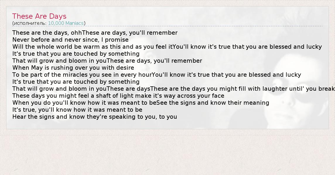 These are the days, ohhThese are days, you'll remember Never before and never since, I promise Will the whole world be warm as this and as you feel itYou'll know it's true that you are blessed and lucky It's true that you are touched by something That will grow and bloom in youThese are days, you'll remember When May is rushing over you with desire To be part of the miracles you see in every hourYou'll know it's true that you are blessed and lucky It's true that you are touched by something That will grow and bloom in youThese are daysThese are the days you might fill with laughter until' you break These days you might feel a shaft of light make it's way across your face When you do you'll know how it was meant to beSee the signs and know their meaning It's true, you'll know how it was meant to be Hear the signs and know they're speaking to you, to you
