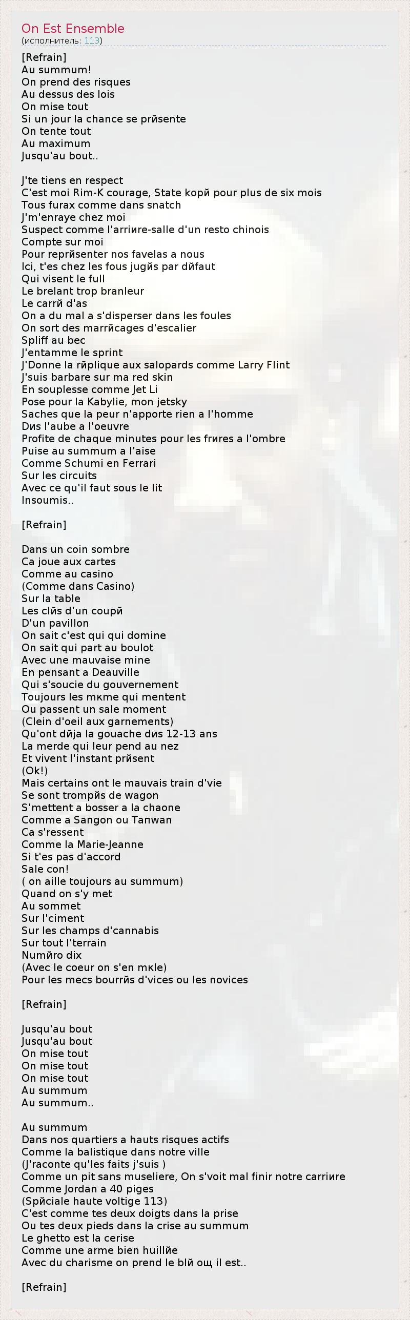 Это интересно:Rim-K родом из Алжира, Mokobe уроженец Мали, A.P. выходец с карибского острова Гваделупа. Хит " Truc de Fou" с их дебютного EP 1998 года заявил о появлении на сцене новых звезд. А дебютный альбом "Les Princes de la Ville", вышедший в 1999 году, только упрочил это ощущение и принес группе настоящий успех. Пластинка была на удивление обласкана критиками. Над диском поработала плеяда талантливых продюсеров... продолжение