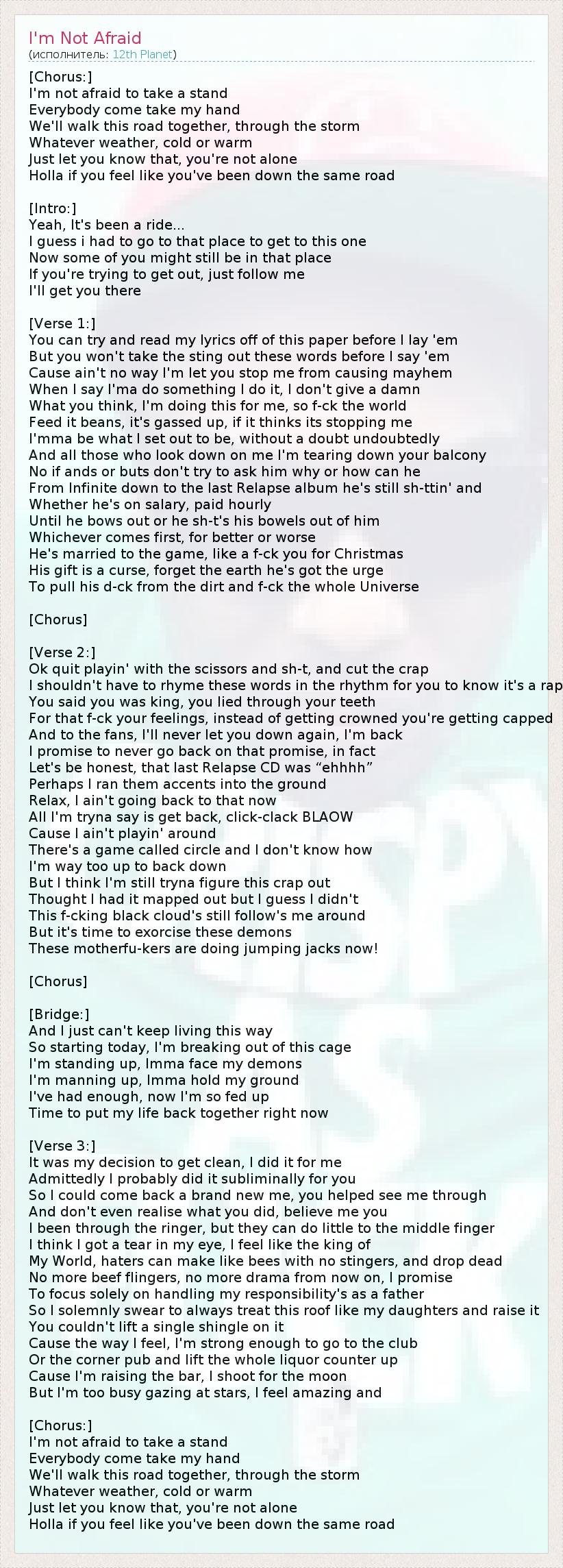 [Chorus:] I'm not afraid to take a stand Everybody come take my hand We'll walk this road together, through the storm Whatever weather, cold or warm Just let you know that, you're not alone Holla if you feel like you've been down the same road [Intro:] Yeah, It's been a ride... I guess i had to go to that place to get to this one Now some of you might still be in that place If you're trying to get out, just follow me I'll get you there [Verse 1:] You can try and read my lyrics off of this paper before I lay 'em But you won't take the sting out these words before I say 'em Cause ain't no way I'm let you stop me from causing mayhem When I say I'ma do something I do it, I don't give a damn What you think, I'm doing this for me, so f-ck the world Feed it beans, it's gassed up, if it thinks its stopping me I'mma be what I set out to be, without a doubt undoubtedly And all those who look down on me I'm tearing down your balcony No if ands or buts don't try to ask him why or how can he From Infinite down to the last Relapse album he's still sh-ttin' and Whether he's on salary, paid hourly Until he bows out or he sh-t's his bowels out of him Whichever comes first, for better or worse He's married to the game, like a f-ck you for Christmas His gift is a curse, forget the earth he's got the urge To pull his d-ck from the dirt and f-ck the whole Universe [Chorus] [Verse 2:] Ok quit playin' with the scissors and sh-t, and cut the crap I shouldn't have to rhyme these words in the rhythm for you to know it's a rap You said you was king, you lied through your teeth For that f-ck your feelings, instead of getting crowned you're getting capped And to the fans, I'll never let you down again, I'm back I promise to never go back on that promise, in fact Let's be honest, that last Relapse CD was “ehhhh” Perhaps I ran them accents into the ground Relax, I ain't going back to that now All I'm tryna say is get back, click-clack BLAOW Cause I ain't playin' around There's a game called circle and I don't know how I'm way too up to back down But I think I'm still tryna figure this crap out Thought I had it mapped out but I guess I didn't This f-cking black cloud's still follow's me around But it's time to exorcise these demons These motherfu-kers are doing jumping jacks now! [Chorus] [Bridge:] And I just can't keep living this way So starting today, I'm breaking out of this cage I'm standing up, Imma face my demons I'm manning up, Imma hold my ground I've had enough, now I'm so fed up Time to put my life back together right now [Verse 3:] It was my decision to get clean, I did it for me Admittedly I probably did it subliminally for you So I could come back a brand new me, you helped see me through And don't even realise what you did, believe me you I been through the ringer, but they can do little to the middle finger I think I got a tear in my eye, I feel like the king of My World, haters can make like bees with no stingers, and drop dead No more beef flingers, no more drama from now on, I promise To focus solely on handling my responsibility's as a father So I solemnly swear to always treat this roof like my daughters and raise it You couldn't lift a single shingle on it Cause the way I feel, I'm strong enough to go to the club Or the corner pub and lift the whole liquor counter up Cause I'm raising the bar, I shoot for the moon But I'm too busy gazing at stars, I feel amazing and [Chorus:] I'm not afraid to take a stand Everybody come take my hand We'll walk this road together, through the storm Whatever weather, cold or warm Just let you know that, you're not alone Holla if you feel like you've been down the same road