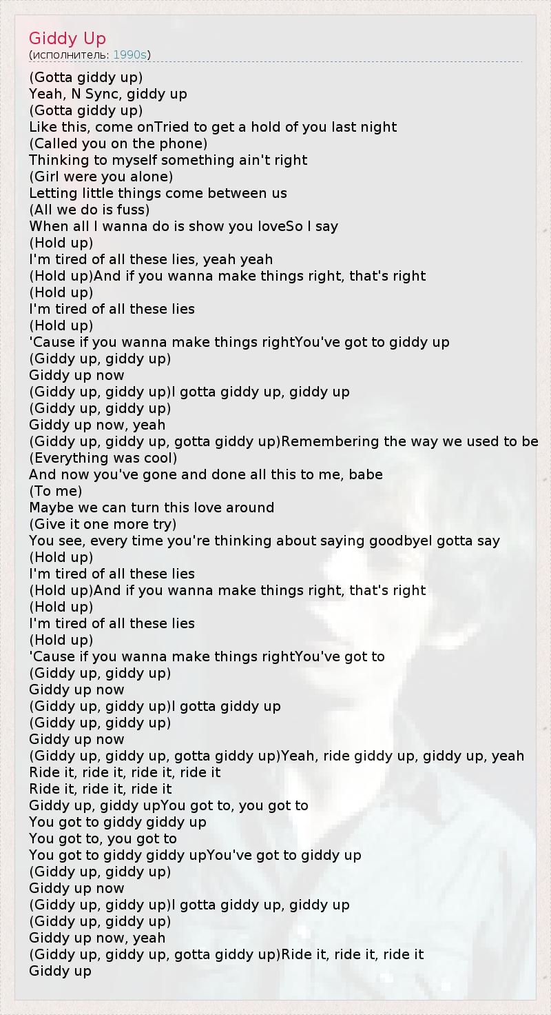 (Gotta giddy up) Yeah, N Sync, giddy up (Gotta giddy up) Like this, come onTried to get a hold of you last night (Called you on the phone) Thinking to myself something ain't right (Girl were you alone) Letting little things come between us (All we do is fuss) When all I wanna do is show you loveSo I say (Hold up) I'm tired of all these lies, yeah yeah (Hold up)And if you wanna make things right, that's right (Hold up) I'm tired of all these lies (Hold up) 'Cause if you wanna make things rightYou've got to giddy up (Giddy up, giddy up) Giddy up now (Giddy up, giddy up)I gotta giddy up, giddy up (Giddy up, giddy up) Giddy up now, yeah (Giddy up, giddy up, gotta giddy up)Remembering the way we used to be (Everything was cool) And now you've gone and done all this to me, babe (To me) Maybe we can turn this love around (Give it one more try) You see, every time you're thinking about saying goodbyeI gotta say (Hold up) I'm tired of all these lies (Hold up)And if you wanna make things right, that's right (Hold up) I'm tired of all these lies (Hold up) 'Cause if you wanna make things rightYou've got to (Giddy up, giddy up) Giddy up now (Giddy up, giddy up)I gotta giddy up (Giddy up, giddy up) Giddy up now (Giddy up, giddy up, gotta giddy up)Yeah, ride giddy up, giddy up, yeah Ride it, ride it, ride it, ride it Ride it, ride it, ride it Giddy up, giddy upYou got to, you got to You got to giddy giddy up You got to, you got to You got to giddy giddy upYou've got to giddy up (Giddy up, giddy up) Giddy up now (Giddy up, giddy up)I gotta giddy up, giddy up (Giddy up, giddy up) Giddy up now, yeah (Giddy up, giddy up, gotta giddy up)Ride it, ride it, ride it Giddy up