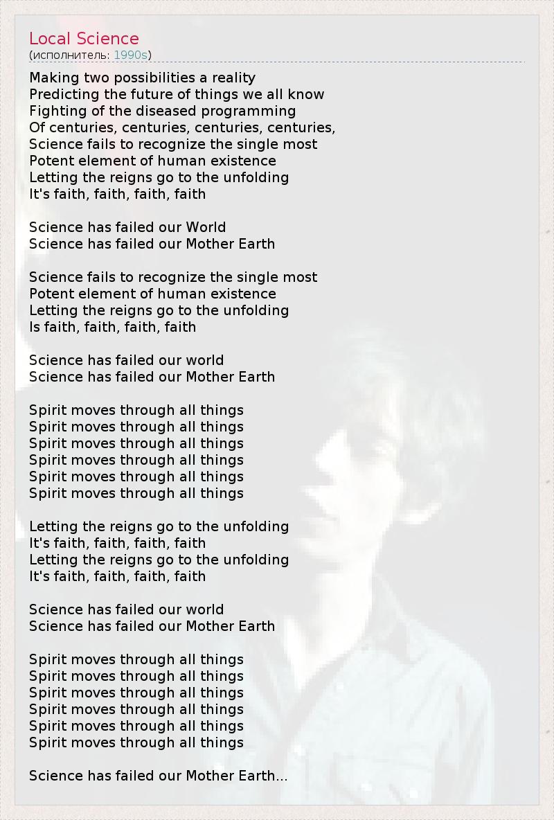 Делая две возможности реальностью, Предсказывая будущее всем нам известных вещей, Борясь с неисправным программированием Столетий, столетий, столетий, Наука не может признать единственный, Самый мощный элемент человеческого существования, Открывающий перед нами целые царства, - Это вера, вера, вера, вера. Наука разрушила наш мир, Наука разрушила нашу матушку-Землю... Наука не может признать единственный, Самый мощный элемент человеческого существования, Открывающий перед нами целые царства, - Это вера, вера, вера, вера. Наука разрушила наш мир, Наука разрушила нашу матушку-Землю... Каждый предмет одухотворен, Каждый предмет одухотворен, Каждый предмет одухотворен, Каждый предмет одухотворен, Каждый предмет одухотворен, Каждый предмет одухотворен... Открывает перед нами целые царства, - Это вера, вера, вера, вера. Открывает перед нами целые царства, - Это вера, вера, вера, вера. Наука разрушила наш мир, Наука разрушила нашу матушку-Землю... Каждый предмет одухотворен, Каждый предмет одухотворен, Каждый предмет одухотворен, Каждый предмет одухотворен, Каждый предмет одухотворен, Каждый предмет одухотворен... Наука разрушила нашу матушку-Землю...