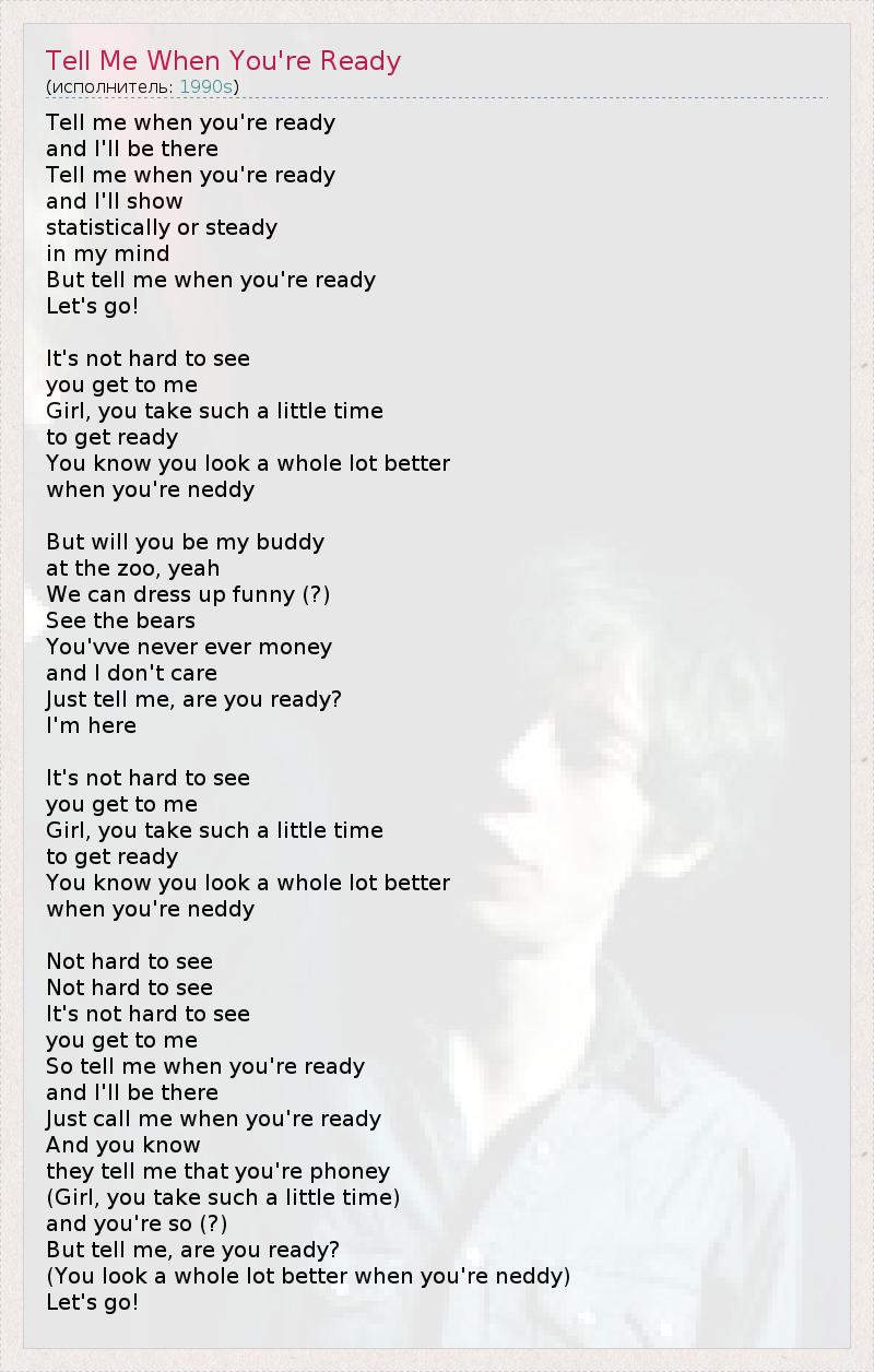 Tell me when you're ready and I'll be there Tell me when you're ready and I'll show statistically or steady in my mind But tell me when you're ready Let's go! It's not hard to see you get to me Girl, you take such a little time to get ready You know you look a whole lot better when you're neddy But will you be my buddy at the zoo, yeah We can dress up funny (?) See the bears You'vve never ever money and I don't care Just tell me, are you ready? I'm here It's not hard to see you get to me Girl, you take such a little time to get ready You know you look a whole lot better when you're neddy Not hard to see Not hard to see It's not hard to see you get to me So tell me when you're ready and I'll be there Just call me when you're ready And you know they tell me that you're phoney (Girl, you take such a little time) and you're so (?) But tell me, are you ready? (You look a whole lot better when you're neddy) Let's go!