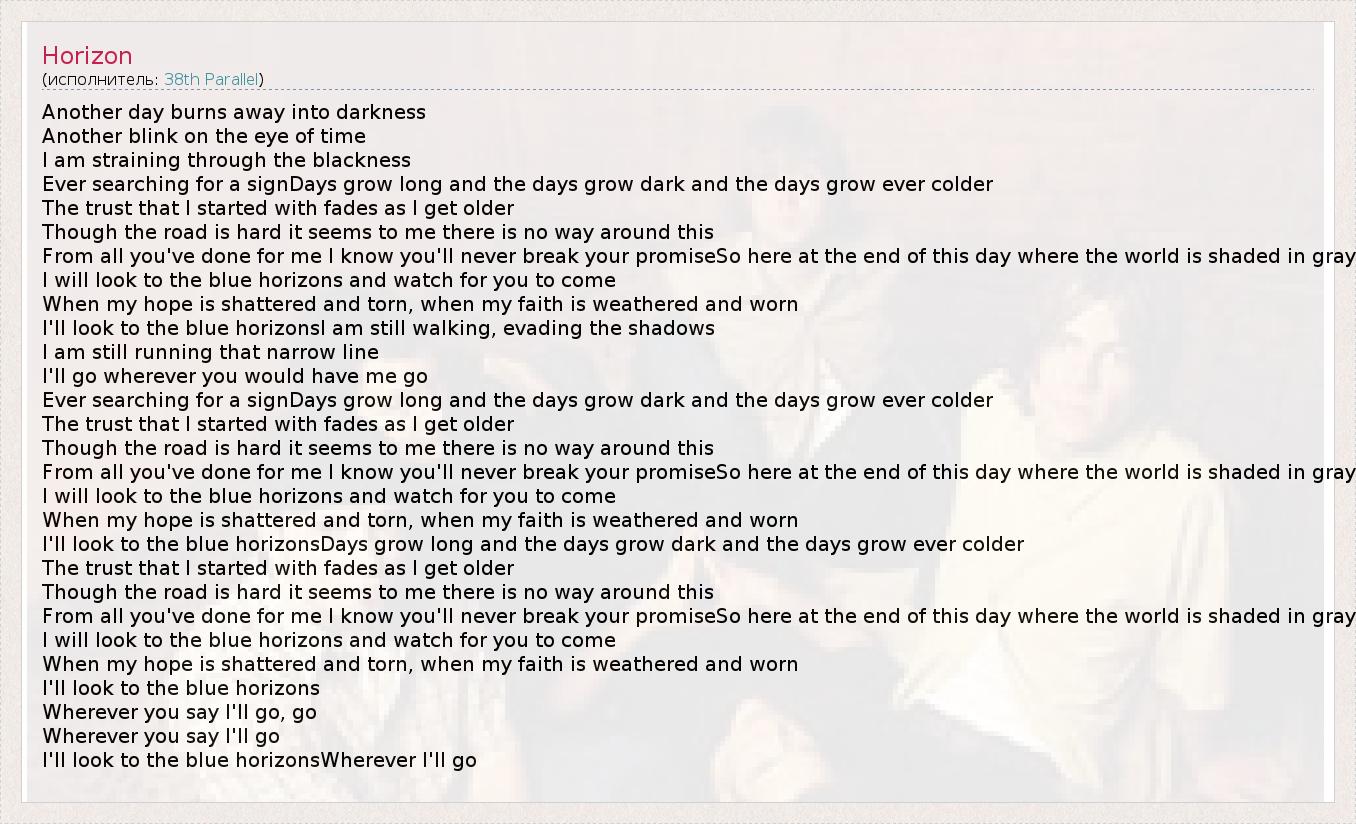 Another day burns away into darkness Another blink on the eye of time I am straining through the blackness Ever searching for a signDays grow long and the days grow dark and the days grow ever colder The trust that I started with fades as I get older Though the road is hard it seems to me there is no way around this From all you've done for me I know you'll never break your promiseSo here at the end of this day where the world is shaded in gray I will look to the blue horizons and watch for you to come When my hope is shattered and torn, when my faith is weathered and worn I'll look to the blue horizonsI am still walking, evading the shadows I am still running that narrow line I'll go wherever you would have me go Ever searching for a signDays grow long and the days grow dark and the days grow ever colder The trust that I started with fades as I get older Though the road is hard it seems to me there is no way around this From all you've done for me I know you'll never break your promiseSo here at the end of this day where the world is shaded in gray I will look to the blue horizons and watch for you to come When my hope is shattered and torn, when my faith is weathered and worn I'll look to the blue horizonsDays grow long and the days grow dark and the days grow ever colder The trust that I started with fades as I get older Though the road is hard it seems to me there is no way around this From all you've done for me I know you'll never break your promiseSo here at the end of this day where the world is shaded in gray I will look to the blue horizons and watch for you to come When my hope is shattered and torn, when my faith is weathered and worn I'll look to the blue horizons Wherever you say I'll go, go Wherever you say I'll go I'll look to the blue horizonsWherever I'll go