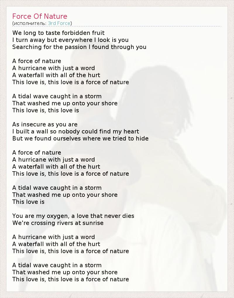 Мы жаждем вкусить запретный плод, Куда бы я ни обернулась, повсюду я вижу лишь тебя, Я ищу ту страсть, что я нашла в тебе Сила природы, Одним словом, ураган, Водопад боли, Эта любовь, эта любовь - сила природы Огромная волна во время шторма, Что выбросила меня на твой берег, Эта любовь, эта любовь... Будучи такой же неуверенной, как и ты, Я построила стену, чтобы никто не смог найти моё сердце, Но мы оказались там, где пытались спрятаться Сила природы, Одним словом, ураган, Водопад боли, Эта любовь, эта любовь - сила природы Огромная волна во время шторма, Что выбросила меня на твой берег, Эта любовь... Ты мой кислород, любовь, что никогда не умирает, Мы пересекаем реки на рассвете Одним словом, ураган, Водопад боли, Эта любовь, эта любовь - сила природы. Огромная волна во время шторма, Что выбросила меня на твой берег, Эта любовь, эта любовь - сила природы
