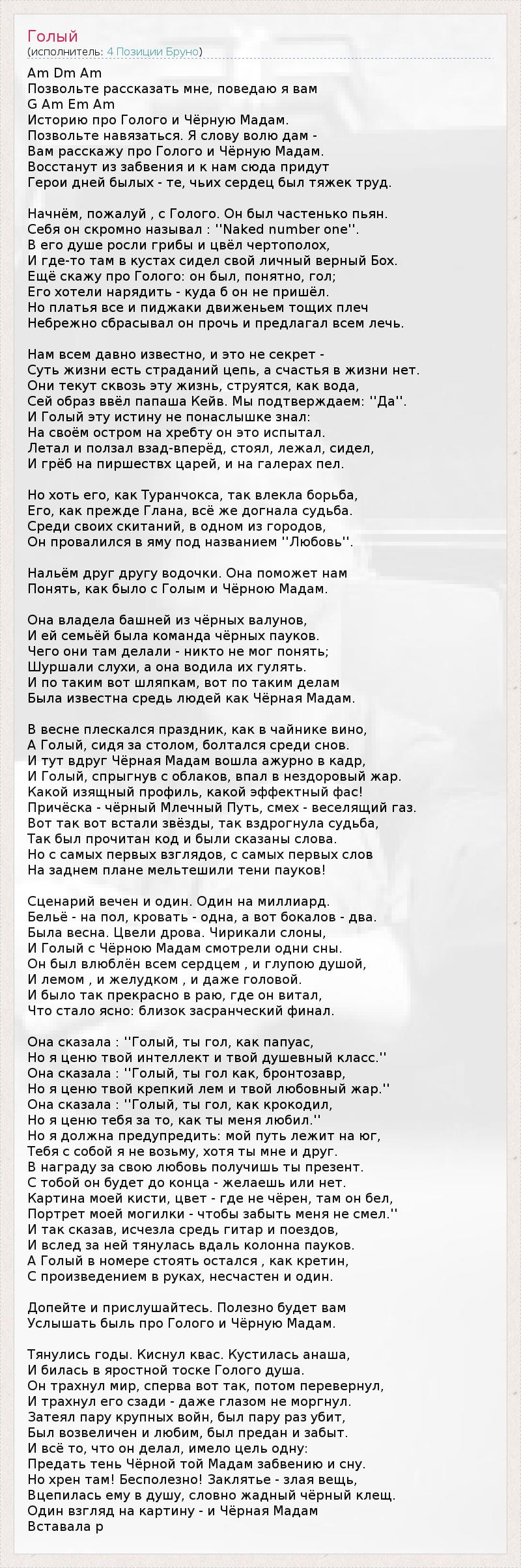 Am Dm Am Позвольте рассказать мне, поведаю я вам G Am Em Am Историю про Голого и Чёрную Мадам. Позвольте навязаться. Я слову волю дам - Вам расскажу про Голого и Чёрную Мадам. Восстанут из забвения и к нам сюда придут Герои дней былых - те, чьих сердец был тяжек труд. Начнём, пожалуй , с Голого. Он был частенько пьян. Себя он скромно называл : ''Naked number one''. В его душе росли грибы и цвёл чертополох, И где-то там в кустах сидел свой личный верный Бох. Ещё скажу про Голого: он был, понятно, гол; Его хотели нарядить - куда б он не пришёл. Но платья все и пиджаки движеньем тощих плеч Небрежно сбрасывал он прочь и предлагал всем лечь. Нам всем давно известно, и это не секрет - Суть жизни есть страданий цепь, а счастья в жизни нет. Они текут сквозь эту жизнь, струятся, как вода, Сей образ ввёл папаша Кейв. Мы подтверждаем: ''Да''. И Голый эту истину не понаслышке знал: На своём остром на хребту он это испытал. Летал и ползал взад-вперёд, стоял, лежал, сидел, И грёб на пиршествх царей, и на галерах пел. Но хоть его, как Туранчокса, так влекла борьба, Его, как прежде Глана, всё же догнала судьба. Среди своих скитаний, в одном из городов, Он провалился в яму под названием ''Любовь''. Нальём друг другу водочки. Она поможет нам Понять, как было с Голым и Чёрною Мадам. Она владела башней из чёрных валунов, И ей семьёй была команда чёрных пауков. Чего они там делали - никто не мог понять; Шуршали слухи, а она водила их гулять. И по таким вот шляпкам, вот по таким делам Была известна средь людей как Чёрная Мадам. В весне плескался праздник, как в чайнике вино, А Голый, сидя за столом, болтался среди снов. И тут вдруг Чёрная Мадам вошла ажурно в кадр, И Голый, спрыгнув с облаков, впал в нездоровый жар. Какой изящный профиль, какой эффектный фас! Причёска - чёрный Млечный Путь, смех - веселящий газ. Вот так вот встали звёзды, так вздрогнула судьба, Так был прочитан код и были сказаны слова. Но с самых первых взглядов, с самых первых слов На заднем плане мельтешили тени пауков! Сценарий вечен и один. Один на миллиард. Бельё - на пол, кровать - одна, а вот бокалов - два. Была весна. Цвели дрова. Чирикали слоны, И Голый с Чёрною Мадам смотрели одни сны. Он был влюблён всем сердцем , и глупою душой, И лемом , и желудком , и даже головой. И было так прекрасно в раю, где он витал, Что стало ясно: близок засранческий финал. Она сказала : ''Голый, ты гол, как папуас, Но я ценю твой интеллект и твой душевный класс.'' Она сказала : ''Голый, ты гол как, бронтозавр, Но я ценю твой крепкий лем и твой любовный жар.'' Она сказала : ''Голый, ты гол, как крокодил, Но я ценю тебя за то, как ты меня любил.'' Но я должна предупредить: мой путь лежит на юг, Тебя с собой я не возьму, хотя ты мне и друг. В награду за свою любовь получишь ты презент. С тобой он будет до конца - желаешь или нет. Картина моей кисти, цвет - где не чёрен, там он бел, Портрет моей могилки - чтобы забыть меня не смел.'' И так сказав, исчезла средь гитар и поездов, И вслед за ней тянулась вдаль колонна пауков. А Голый в номере стоять остался , как кретин, С произведением в руках, несчастен и один. Допейте и прислушайтесь. Полезно будет вам Услышать быль про Голого и Чёрную Мадам. Тянулись годы. Киснул квас. Кустилась анаша, И билась в яростной тоске Голого душа. Он трахнул мир, сперва вот так, потом перевернул, И трахнул его сзади - даже глазом не моргнул. Затеял пару крупных войн, был пару раз убит, Был 