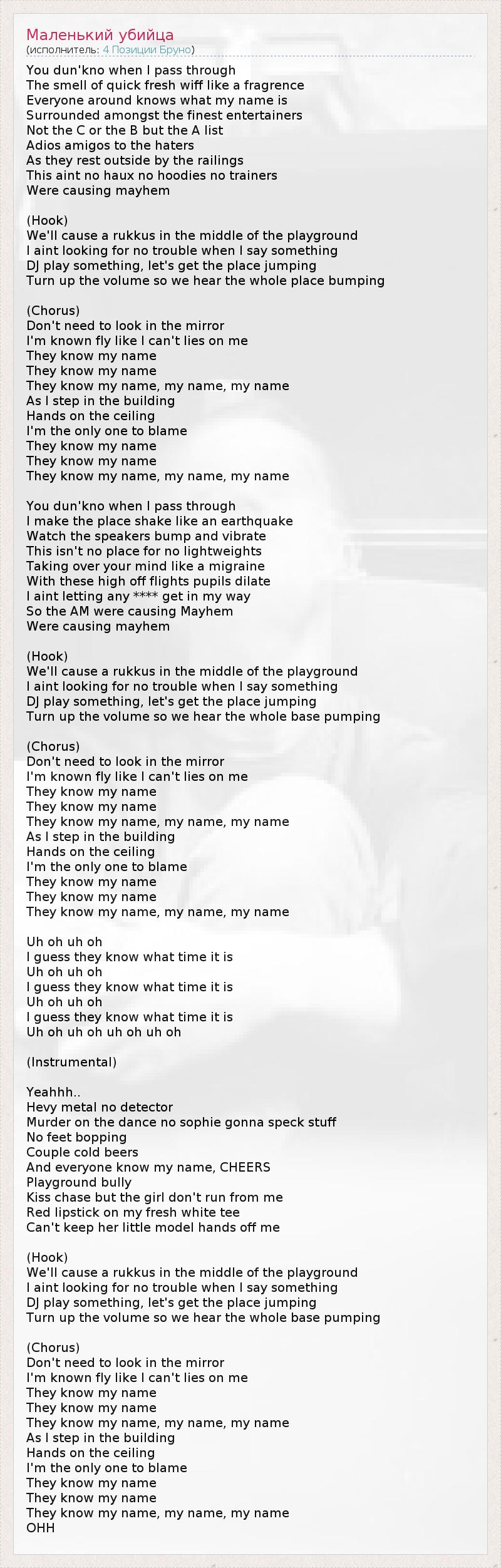 Вы dun'kno когда я прохожу через Запах быстрого свежего дуновение как fragrence Все вокруг знают, что меня зовут Окруженный среди лучших артистов НеС илиВ , но список Adios Amigos до ненавистников Как они отдыхают снаружи перила Это не не Haux нет толстовки нет тренеров Были побоев ( Крюк ) Мы будем вызывать rukkus в середине детской площадке Я не ищет без проблем , когда я говорю что-то DJ играть что-то , давайте получить место прыжки Увеличьте громкость так мы слышим целое место натыкаясь (Припев) Не нужно смотреть на себя в зеркало Я известен летать, как я не могу ложь на меня Они знают мое имя Они знают мое имя Они знают мое имя , мое имя , меня зовут Как я шаг в здании Руки на потолке Я единственный , кто виноват Они знают мое имя Они знают мое имя Они знают мое имя , мое имя , меня зовут Вы dun'kno когда я прохожу через Я делаю место волноваться, как землетрясения Часы громкоговорители удар и вибрацию Это не не место для не легковесов Принимая над вашим разумом , как мигрени С эти высокие ученики прочь рейсы расширяются Я не позволяя ни одному **** получить на моем пути Таким образом, М. вызывали Mayhem Были побоев ( Крюк ) Мы будем вызывать rukkus в середине детской площадке Я не ищет без проблем , когда я говорю что-то DJ играть что-то , давайте получить место прыжки Увеличьте громкость так мы слышим всю базовую перекачку (Припев) Не нужно смотреть на себя в зеркало Я известен летать, как я не могу ложь на меня Они знают мое имя Они знают мое имя Они знают мое имя , мое имя , меня зовут Как я шаг в здании Руки на потолке Я единственный , кто виноват Они знают мое имя Они знают мое имя Они знают мое имя , мое имя , меня зовут Ой-ой Ой-ой Я предполагаю, что они знают , во сколько это Ой-ой Ой-ой Я предполагаю, что они знают , во сколько это Ой-ой Ой-ой Я предполагаю, что они знают , во сколько это Ой-ой Ой-ой Ой-ой Ой-ой ( Инструментальная ) Yeahhh .. Хеви металл нет детектор Убийство в танце не Софи не будем пятнышко материал Нет футов бибоп Пара холодное пиво И все знают мое имя , ура площадка хулиган Поцелуй в погоню , но девушка не убегай от меня Красная помада на моем свежей белой мишени Не можете держать свои маленькие модели руки от меня ( Крюк ) Мы будем вызывать rukkus в середине детской площадке Я не ищет без проблем , когда я говорю что-то DJ играть что-то , давайте получить место прыжки Увеличьте громкость так мы слышим всю базовую перекачку (Припев) Не нужно смотреть на себя в зеркало Я известен летать, как я не могу ложь на меня Они знают мое имя Они знают мое имя Они знают мое имя , мое имя , меня зовут Как я шаг в здании Руки на потолке Я единственный , кто виноват Они знают мое имя Они знают мое имя Они знают мое имя , мое имя , меня зовут OHH