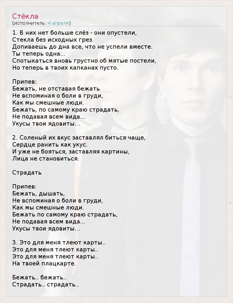 1. В них нет больше слёз - они опустели, Стекла без исходных грез. Допиваешь до дна все, что не успели вместе. Ты теперь одна... Спотыкаться вновь грустно об мятые постели, Но теперь в твоих капканах пусто. Припев: Бежать, не отставая бежать Не вспоминая о боли в груди, Как мы смешные люди. Бежать, по самому краю страдать, Не подавая всем вида... Укусы твои ядовиты… 2. Соленый их вкус заставлял биться чаще, Сердце ранить как укус. И уже не бояться, заставляя картины, Лица не становиться. Страдать Припев: Бежать, дышать, Не вспоминая о боли в груди, Как мы смешные люди. Бежать по самому краю страдать, Не подавая всем вида... Укусы твои ядовиты… 3. Это для меня тлеют карты.. Это для меня тлеют карты.. Это для меня тлеют карты.. На твоей плацкарте. Бежать.. бежать.. Страдать.. страдать..