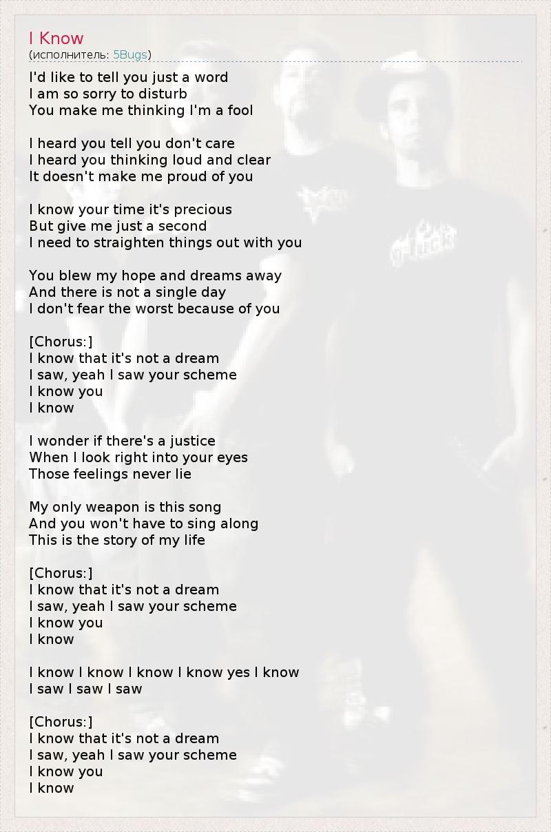 Я бы хотела кое-что сказать тебе. Мне очень неудобно тебя беспокоить, Но ты заставляешь меня чувствовать себя дурой. Я слышала, как ты говорил, что тебе всё равно, Я даже слышала, как ты отчётливо думал об этом, И после этого я вряд ли буду гордиться тобой. Я знаю, что тебе дорога каждая минута, Но дай мне хоть секунду - Нам нужно расставить точки над "и". Ты прогнал мои надежды и мечты, И не проходит и дня, Чтобы я не опасалась худшего из-за тебя... [Припев:] Я знаю, что это не сон, Я поняла, да, я поняла твой замысел. Я знаю тебя, Я знаю... Интересно, есть ли справедливость. Когда я смотрю тебе в глаза, Эти чувства никогда не лгут... Моё единственное оружие - эта песня, И тебе не придётся подпевать: Это история моéй жизни. [Припев:] Я знаю, что это не сон, Я поняла, да, я поняла твой замысел. Я знаю тебя, Я знаю... Я знаю, я знаю, да, я знаю, Я поняла, поняла, поняла... [Припев:] Я знаю, что это не сон, Я поняла, да, я поняла твой замысел. Я знаю тебя, Я знаю...