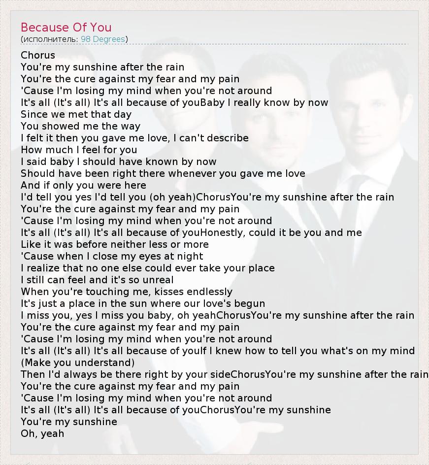 Chorus You're my sunshine after the rain You're the cure against my fear and my pain 'Cause I'm losing my mind when you're not around It's all (It's all) It's all because of youBaby I really know by now Since we met that day You showed me the way I felt it then you gave me love, I can't describe How much I feel for you I said baby I should have known by now Should have been right there whenever you gave me love And if only you were here I'd tell you yes I'd tell you (oh yeah)ChorusYou're my sunshine after the rain You're the cure against my fear and my pain 'Cause I'm losing my mind when you're not around It's all (It's all) It's all because of youHonestly, could it be you and me Like it was before neither less or more 'Cause when I close my eyes at night I realize that no one else could ever take your place I still can feel and it's so unreal When you're touching me, kisses endlessly It's just a place in the sun where our love's begun I miss you, yes I miss you baby, oh yeahChorusYou're my sunshine after the rain You're the cure against my fear and my pain 'Cause I'm losing my mind when you're not around It's all (It's all) It's all because of youIf I knew how to tell you what's on my mind (Make you understand) Then I'd always be there right by your sideChorusYou're my sunshine after the rain You're the cure against my fear and my pain 'Cause I'm losing my mind when you're not around It's all (It's all) It's all because of youChorusYou're my sunshine You're my sunshine Oh, yeah