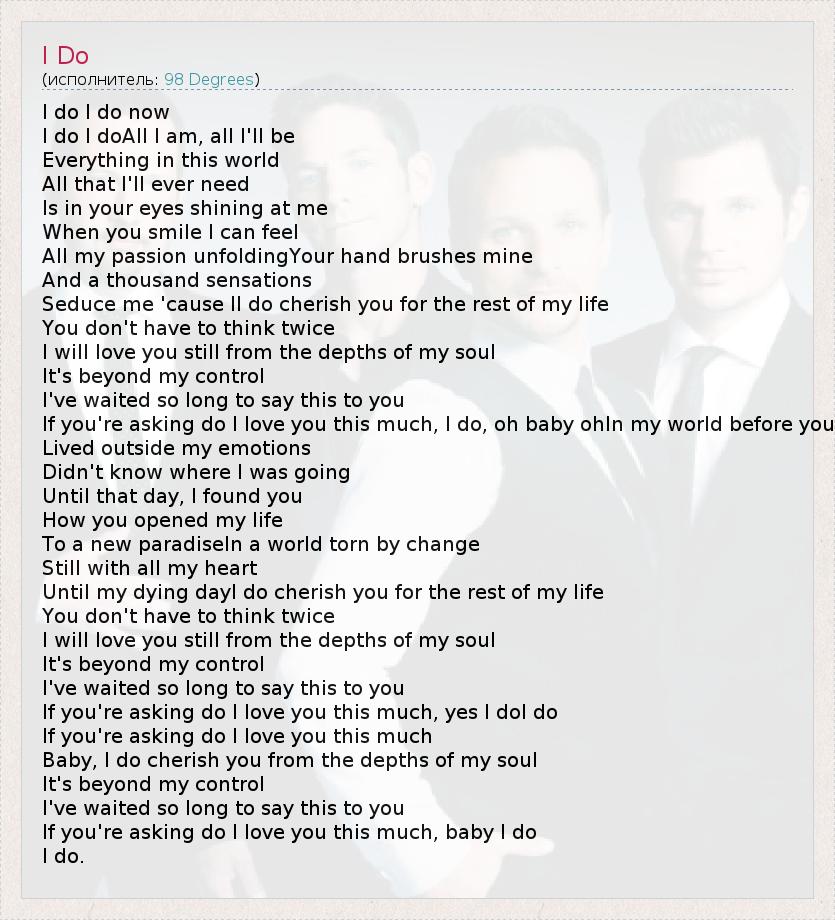 I do I do now I do I doAll I am, all I'll be Everything in this world All that I'll ever need Is in your eyes shining at me When you smile I can feel All my passion unfoldingYour hand brushes mine And a thousand sensations Seduce me 'cause II do cherish you for the rest of my life You don't have to think twice I will love you still from the depths of my soul It's beyond my control I've waited so long to say this to you If you're asking do I love you this much, I do, oh baby ohIn my world before you Lived outside my emotions Didn't know where I was going Until that day, I found you How you opened my life To a new paradiseIn a world torn by change Still with all my heart Until my dying dayI do cherish you for the rest of my life You don't have to think twice I will love you still from the depths of my soul It's beyond my control I've waited so long to say this to you If you're asking do I love you this much, yes I doI do If you're asking do I love you this much Baby, I do cherish you from the depths of my soul It's beyond my control I've waited so long to say this to you If you're asking do I love you this much, baby I do I do.