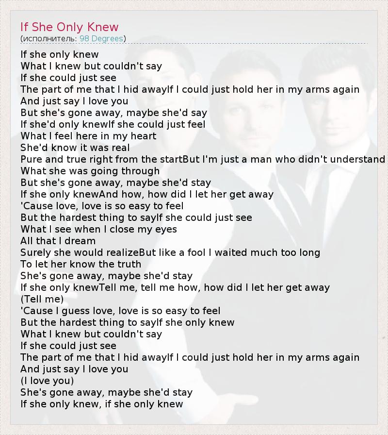 If she only knew What I knew but couldn't say If she could just see The part of me that I hid awayIf I could just hold her in my arms again And just say I love you But she's gone away, maybe she'd say If she'd only knewIf she could just feel What I feel here in my heart She'd know it was real Pure and true right from the startBut I'm just a man who didn't understand What she was going through But she's gone away, maybe she'd stay If she only knewAnd how, how did I let her get away 'Cause love, love is so easy to feel But the hardest thing to sayIf she could just see What I see when I close my eyes All that I dream Surely she would realizeBut like a fool I waited much too long To let her know the truth She's gone away, maybe she'd stay If she only knewTell me, tell me how, how did I let her get away (Tell me) 'Cause I guess love, love is so easy to feel But the hardest thing to sayIf she only knew What I knew but couldn't say If she could just see The part of me that I hid awayIf I could just hold her in my arms again And just say I love you (I love you) She's gone away, maybe she'd stay If she only knew, if she only knew