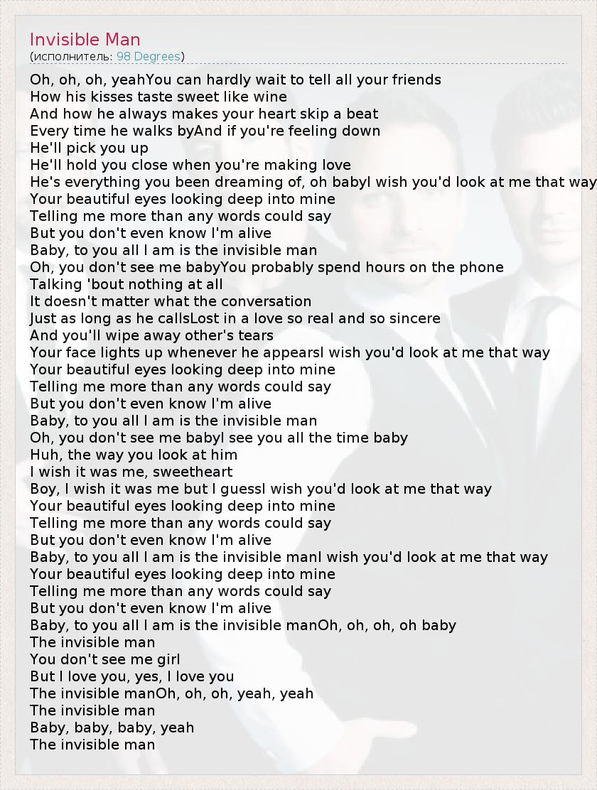 Oh, oh, oh, yeahYou can hardly wait to tell all your friends How his kisses taste sweet like wine And how he always makes your heart skip a beat Every time he walks byAnd if you're feeling down He'll pick you up He'll hold you close when you're making love He's everything you been dreaming of, oh babyI wish you'd look at me that way Your beautiful eyes looking deep into mine Telling me more than any words could say But you don't even know I'm alive Baby, to you all I am is the invisible man Oh, you don't see me babyYou probably spend hours on the phone Talking 'bout nothing at all It doesn't matter what the conversation Just as long as he callsLost in a love so real and so sincere And you'll wipe away other's tears Your face lights up whenever he appearsI wish you'd look at me that way Your beautiful eyes looking deep into mine Telling me more than any words could say But you don't even know I'm alive Baby, to you all I am is the invisible man Oh, you don't see me babyI see you all the time baby Huh, the way you look at him I wish it was me, sweetheart Boy, I wish it was me but I guessI wish you'd look at me that way Your beautiful eyes looking deep into mine Telling me more than any words could say But you don't even know I'm alive Baby, to you all I am is the invisible manI wish you'd look at me that way Your beautiful eyes looking deep into mine Telling me more than any words could say But you don't even know I'm alive Baby, to you all I am is the invisible manOh, oh, oh, oh baby The invisible man You don't see me girl But I love you, yes, I love you The invisible manOh, oh, oh, yeah, yeah The invisible man Baby, baby, baby, yeah The invisible man