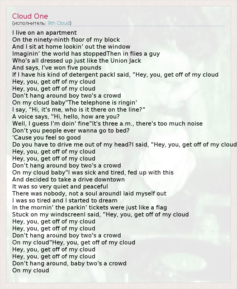 Do you have to drive me out of my head?I said, "Hey, you, get off of my cloud