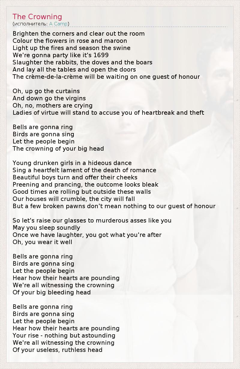 Это интересно:A Camp — сольный инди-поп-проект шведской певицы Нины Перссон, вокалистки группы The Cardigans. В состав A Camp входят: Нина Перссон (Nina Persson) — вокал, пианино, лирика; ее муж Натан Ларсон (Nathan Larson) — гитара, клавишные, бэк-вокал, лирика; Никлас Фриск (Niclas Frisk) — гитара, орган, бэк-вокал, лирика.Нина Перссон (полное... продолжение