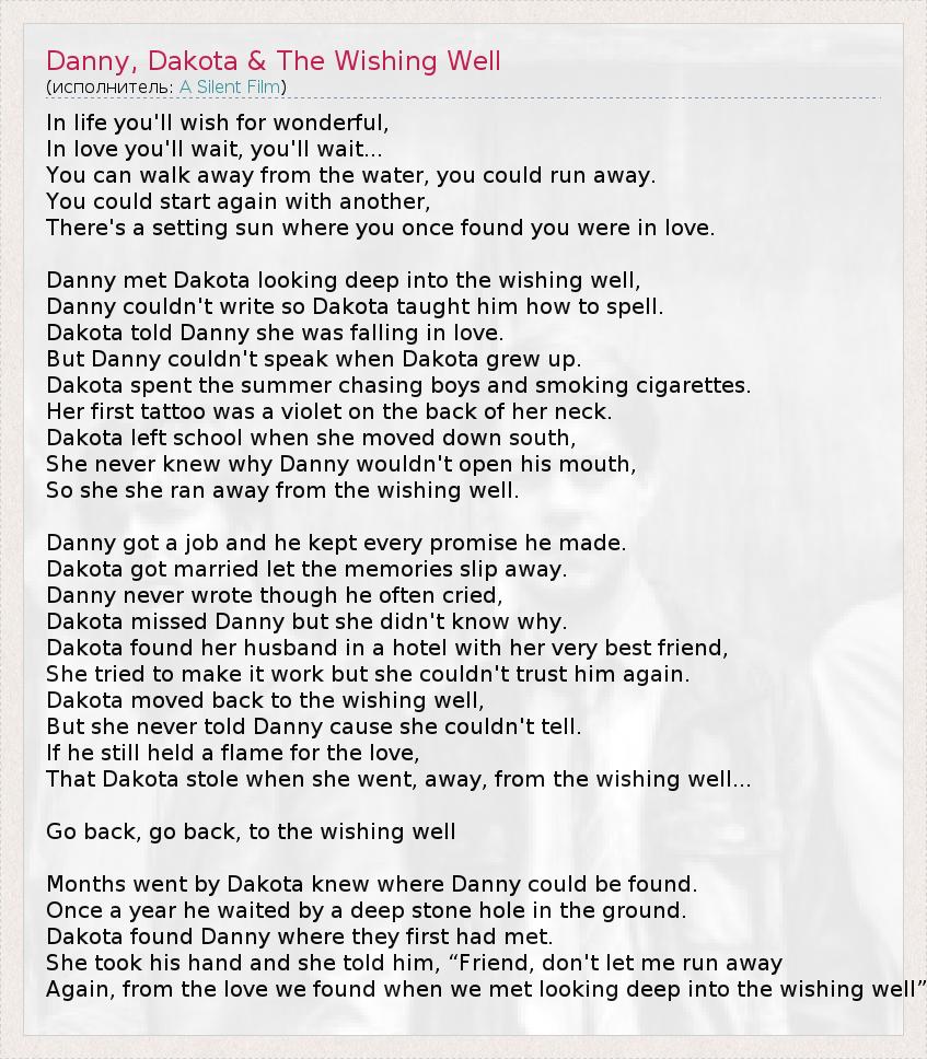В жизни ты будешь стремиться ко всему прекрасному, В любви ты будешь ждать, будешь ждать... Отойдя от водоёма, ты смогла сбежать, Смогла начать всё заново с другим... И теперь солнце заходит в том месте, где однажды ты поняла, что влюбилась. Денни встретил Дакоту, когда она смотрела вглубь колодца желаний. Денни не умел писать, и Дакота научила его писать по буквам. Дакота призналась Денни, что она в него влюбляется. Но Денни не смог заговорить с ней, когда Дакота выросла. Дакота провела лето, гоняясь за парнями и выкуривая сигареты. Её первым тату была фиалка, выбитая на затылке. Дакоте пришлось уйти из школы, когда она переехала на юг. Она так и не поняла, почему Денни не раскрыл рта, И потому убежала от колодца желаний. Денни нашел работу, он сдержал все свои обещания. Дакота вышла замуж, позволив воспоминаниям угаснуть. Денни не писал, хотя и плакал очень часто. Дакота скучала по Денни, не зная почему. Дакота застукала мужа в отеле со своей самой лучшей подругой, Она попыталась наладить отношения, но не смогла ему больше доверять. Дакота возвращалась к колодцу желаний, Но она ни разу не сказала об этом Денни, потому что просто не знала, Горит ли в нём всё ещё огонёк любви, Который Дакота украла, сбежав от колодца желаний. Возвращайся, возвращайся к колодцу желаний! Шли месяцы, Дакота знала, где можно найти Денни. Раз в год она ждала его подле глубокой каменной дыры в земле. Дакота отыскала Денни там, где они впервые встретились. Она взяла его за руку и сказала: "Друг мой, не позволяй мне сбежать Вновь от той любви, что мы отыскали, когда встретились, заглядывая вглубь колодца желаний".