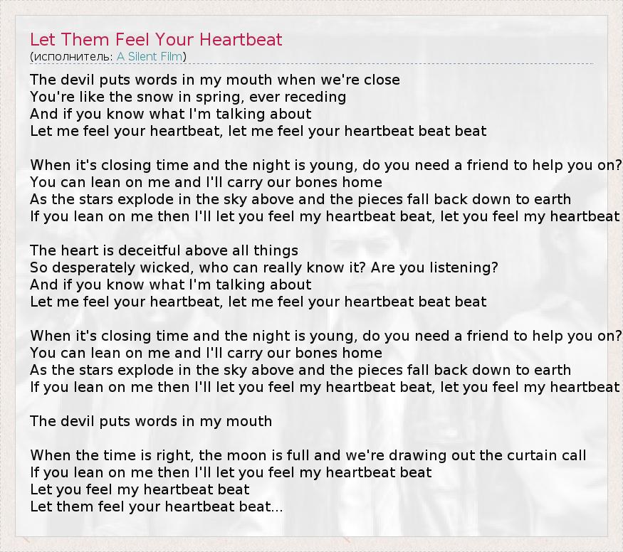 Дьявол говорит во мне, когда мы рядом, Ты - словно непрерывно падающий на землю снег весной. И, если ты понимаешь, о чем я, Позволь мне почувствовать твое сердцебиение, позволь мне почувствовать твое сердцебиение, Когда приходит время закрываться, а ночь еще только начинается, нужен ли тебе друг, который подаст пальто? Можешь положиться на меня, я доставлю твое тело домой, Пока звезды взрываются в небесах, а осколки падают на землю. Если ты положишься на меня, я позволю тебе почувствовать мое сердцебиение. Сердце прежде всего лжет, Оно так отчаянно грешно, кто по настоящему поймет его? Ты меня слушаешь? И, если ты понимаешь, о чем я Позволь мне почувствовать твое сердцебиение, позволь мне почувствовать твое сердцебиение, Когда приходит время закрываться, а ночь еще только начинается, нужен ли тебе друг, который подаст пальто? Можешь положиться на меня, я доставлю твое тело домой, Пока звезды взрываются в небесах, а осколки падают на землю. Если ты положишься на меня, я позволю тебе почувствовать мое сердцебиение. Дьявол говорит во мне Когда подходит время, луна полная, а мы все оттягиваем наш выход на бис, Если ты положишься на меня, я позволю тебе почувствовать мое сердцебиение Я позволю тебе почувствовать мое сердцебиение Позволь им почувствовать твое сердцебиение