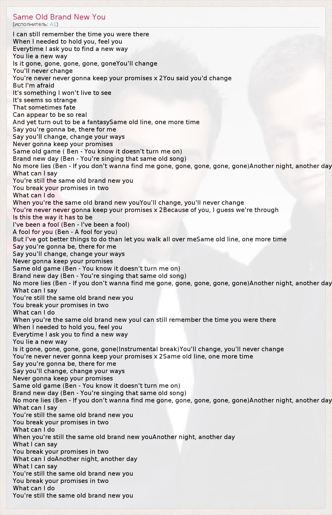I can still remember the time you were there When I needed to hold you, feel you Everytime I ask you to find a new way You lie a new way Is it gone, gone, gone, gone, goneYou'll change You'll never change You're never never gonna keep your promises x 2You said you'd change But I'm afraid It's something I won't live to see It's seems so strange That sometimes fate Can appear to be so real And yet turn out to be a fantasySame old line, one more time Say you're gonna be, there for me Say you'll change, change your ways Never gonna keep your promises Same old game ( Ben - You know it doesn't turn me on) Brand new day (Ben - You're singing that same old song) No more lies (Ben - If you don't wanna find me gone, gone, gone, gone, gone)Another night, another day What can I say You're still the same old brand new you You break your promises in two What can I do When you're the same old brand new youYou'll change, you'll never change You're never never gonna keep your promises x 2Because of you, I guess we're through Is this the way it has to be I've been a fool (Ben - I've been a fool) A fool for you (Ben - A fool for you) But I've got better things to do than let you walk all over meSame old line, one more time Say you're gonna be, there for me Say you'll change, change your ways Never gonna keep your promises Same old game (Ben - You know it doesn't turn me on) Brand new day (Ben - You're singing that same old song) No more lies (Ben - If you don't wanna find me gone, gone, gone, gone, gone)Another night, another day What can I say You're still the same old brand new you You break your promises in two What can I do When you're the same old brand new youI can still remember the time you were there When I needed to hold you, feel you Everytime I ask you to find a new way You lie a new way Is it gone, gone, gone, gone, gone(Instrumental break)You'll change, you'll never change You're never never gonna keep your promises x 2Same old line, one more time Say you're gonna be, there for me Say you'll change, change your ways Never gonna keep your promises Same old game (Ben - You know it doesn't turn me on) Brand new day (Ben - You're singing that same old song) No more lies (Ben - If you don't wanna find me gone, gone, gone, gone, gone)Another night, another day What can I say You're still the same old brand new you You break your promises in two What can I do When you're still the same old brand new youAnother night, another day What I can say You break your promises in two What can I doAnother night, another day What I can say You're still the same old brand new you You break your promises in two What can I do You're still the same old brand new you