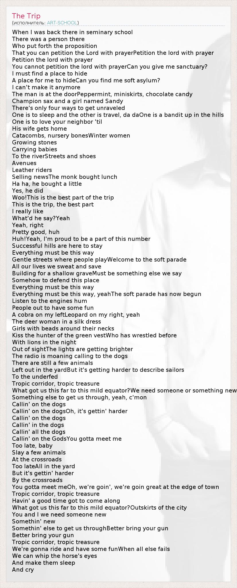 When I was back there in seminary school There was a person there Who put forth the proposition That you can petition the Lord with prayerPetition the lord with prayer Petition the lord with prayer You cannot petition the lord with prayerCan you give me sanctuary? I must find a place to hide A place for me to hideCan you find me soft asylum? I can't make it anymore The man is at the doorPeppermint, miniskirts, chocolate candy Champion sax and a girl named Sandy There's only four ways to get unraveled One is to sleep and the other is travel, da daOne is a bandit up in the hills One is to love your neighbor 'til His wife gets home Catacombs, nursery bonesWinter women Growing stones Carrying babies To the riverStreets and shoes Avenues Leather riders Selling newsThe monk bought lunch Ha ha, he bought a little Yes, he did Woo!This is the best part of the trip This is the trip, the best part I really like What'd he say?Yeah Yeah, right Pretty good, huh Huh!Yeah, I'm proud to be a part of this number Successful hills are here to stay Everything must be this way Gentle streets where people playWelcome to the soft parade All our lives we sweat and save Building for a shallow graveMust be something else we say Somehow to defend this place Everything must be this way Everything must be this way, yeahThe soft parade has now begun Listen to the engines hum People out to have some fun A cobra on my leftLeopard on my right, yeah The deer woman in a silk dress Girls with beads around their necks Kiss the hunter of the green vestWho has wrestled before With lions in the night Out of sightThe lights are getting brighter The radio is moaning calling to the dogs There are still a few animals Left out in the yardBut it's getting harder to describe sailors To the underfed Tropic corridor, tropic treasure What got us this far to this mild equator?We need someone or something new Something else to get us through, yeah, c'mon Callin' on the dogs Callin' on the dogsOh, it's gettin' harder Callin' on the dogs Callin' in the dogs Callin' all the dogs Callin' on the GodsYou gotta meet me Too late, baby Slay a few animals At the crossroads Too lateAll in the yard But it's gettin' harder By the crossroads You gotta meet meOh, we're goin', we're goin great at the edge of town Tropic corridor, tropic treasure Havin' a good time got to come along What got us this far to this mild equator?Outskirts of the city You and I we need someone new Somethin' new Somethin' else to get us throughBetter bring your gun Better bring your gun Tropic corridor, tropic treasure We're gonna ride and have some funWhen all else fails We can whip the horse's eyes And make them sleep And cry