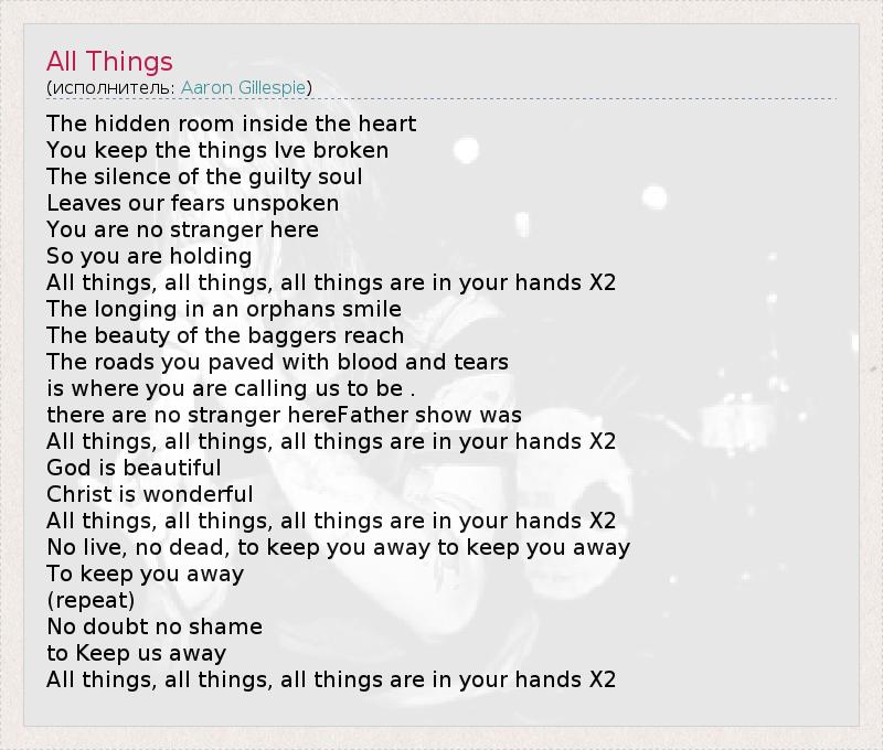 Это интересно:Аарон Родерик Гиллеспи (родился 18 июля 1983 года), являлся барабанщиком / вокалистом в христианской группе UnderOATH, а с 2005 года — барабанщик / вокалист в группе под названием The Almost.Гиллеспи родился в штате Флорида город Клирвотер (Clearwater) и вырос в христианской семье. Он выступал в школах своего города, и был одним из активных членов церкви. Родители Гиллеспи развелись, когда ему было 18. Гиллеспи... продолжение