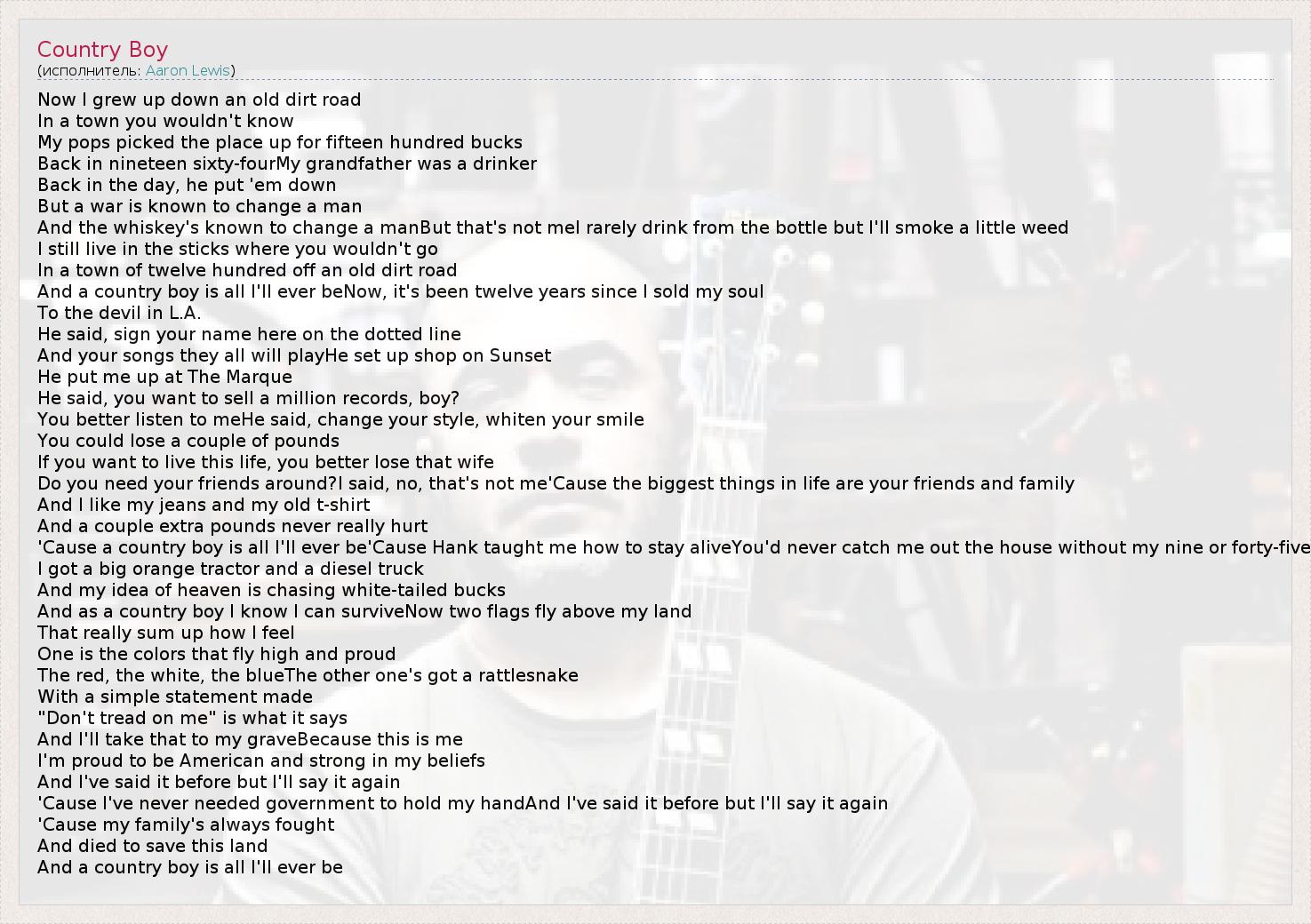 Now I grew up down an old dirt road In a town you wouldn't know My pops picked the place up for fifteen hundred bucks Back in nineteen sixty-fourMy grandfather was a drinker Back in the day, he put 'em down But a war is known to change a man And the whiskey's known to change a manBut that's not meI rarely drink from the bottle but I'll smoke a little weed I still live in the sticks where you wouldn't go In a town of twelve hundred off an old dirt road And a country boy is all I'll ever beNow, it's been twelve years since I sold my soul To the devil in L.A. He said, sign your name here on the dotted line And your songs they all will playHe set up shop on Sunset He put me up at The Marque He said, you want to sell a million records, boy? You better listen to meHe said, change your style, whiten your smile You could lose a couple of pounds If you want to live this life, you better lose that wife Do you need your friends around?I said, no, that's not me'Cause the biggest things in life are your friends and family And I like my jeans and my old t-shirt And a couple extra pounds never really hurt 'Cause a country boy is all I'll ever be'Cause Hank taught me how to stay aliveYou'd never catch me out the house without my nine or forty-five I got a big orange tractor and a diesel truck And my idea of heaven is chasing white-tailed bucks And as a country boy I know I can surviveNow two flags fly above my land That really sum up how I feel One is the colors that fly high and proud The red, the white, the blueThe other one's got a rattlesnake With a simple statement made "Don't tread on me" is what it says And I'll take that to my graveBecause this is me I'm proud to be American and strong in my beliefs And I've said it before but I'll say it again 'Cause I've never needed government to hold my handAnd I've said it before but I'll say it again 'Cause my family's always fought And died to save this land And a country boy is all I'll ever be