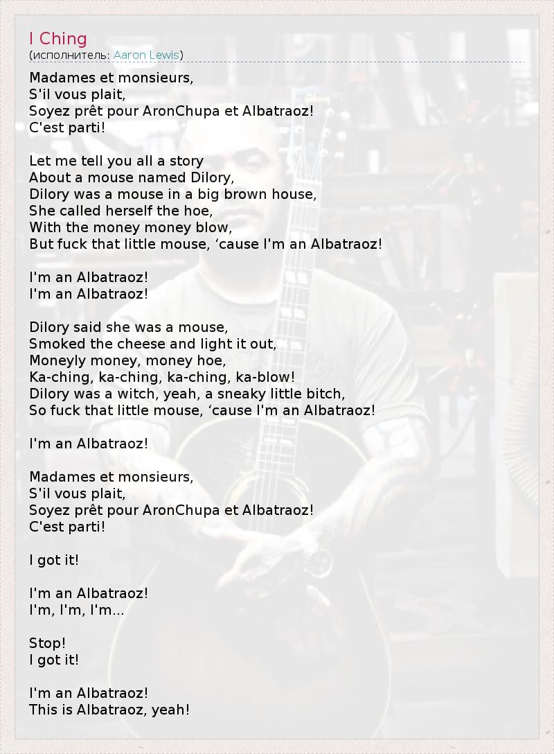 Madames et monsieurs, S'il vous plait, Soyez prêt pour AronChupa et Albatraoz! C'est parti! Let me tell you all a story About a mouse named Dilory, Dilory was a mouse in a big brown house, She called herself the hoe, With the money money blow, But fuck that little mouse, ‘cause I'm an Albatraoz! I'm an Albatraoz! I'm an Albatraoz! Dilory said she was a mouse, Smoked the cheese and light it out, Moneyly money, money hoe, Ka-ching, ka-ching, ka-ching, ka-blow! Dilory was a witch, yeah, a sneaky little bitch, So fuck that little mouse, ‘cause I'm an Albatraoz! I'm an Albatraoz! Madames et monsieurs, S'il vous plait, Soyez prêt pour AronChupa et Albatraoz! C'est parti! I got it! I'm an Albatraoz! I'm, I'm, I'm... Stop! I got it! I'm an Albatraoz! This is Albatraoz, yeah!