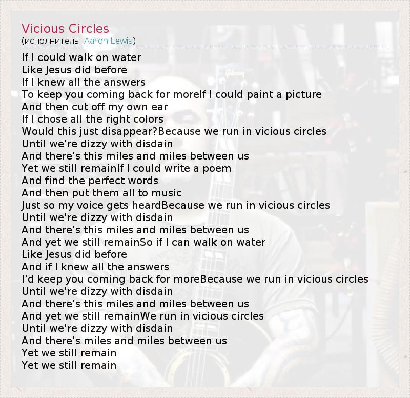If I could walk on water Like Jesus did before If I knew all the answers To keep you coming back for moreIf I could paint a picture And then cut off my own ear If I chose all the right colors Would this just disappear?Because we run in vicious circles Until we're dizzy with disdain And there's this miles and miles between us Yet we still remainIf I could write a poem And find the perfect words And then put them all to music Just so my voice gets heardBecause we run in vicious circles Until we're dizzy with disdain And there's this miles and miles between us And yet we still remainSo if I can walk on water Like Jesus did before And if I knew all the answers I'd keep you coming back for moreBecause we run in vicious circles Until we're dizzy with disdain And there's this miles and miles between us And yet we still remainWe run in vicious circles Until we're dizzy with disdain And there's miles and miles between us Yet we still remain Yet we still remain