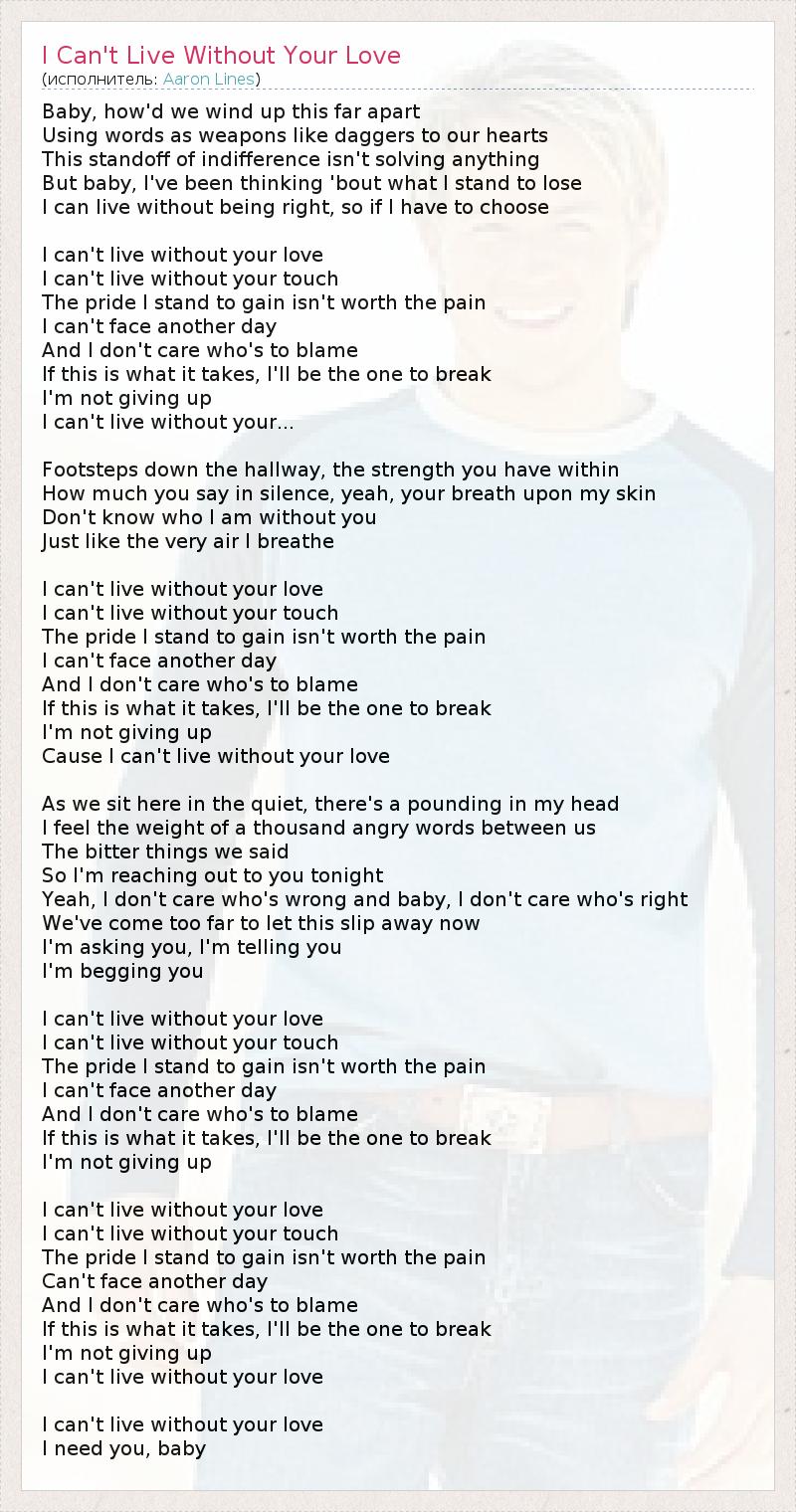 Baby, how'd we wind up this far apart Using words as weapons like daggers to our hearts This standoff of indifference isn't solving anything But baby, I've been thinking 'bout what I stand to lose I can live without being right, so if I have to choose I can't live without your love I can't live without your touch The pride I stand to gain isn't worth the pain I can't face another day And I don't care who's to blame If this is what it takes, I'll be the one to break I'm not giving up I can't live without your... Footsteps down the hallway, the strength you have within How much you say in silence, yeah, your breath upon my skin Don't know who I am without you Just like the very air I breathe I can't live without your love I can't live without your touch The pride I stand to gain isn't worth the pain I can't face another day And I don't care who's to blame If this is what it takes, I'll be the one to break I'm not giving up Cause I can't live without your love As we sit here in the quiet, there's a pounding in my head I feel the weight of a thousand angry words between us The bitter things we said So I'm reaching out to you tonight Yeah, I don't care who's wrong and baby, I don't care who's right We've come too far to let this slip away now I'm asking you, I'm telling you I'm begging you I can't live without your love I can't live without your touch The pride I stand to gain isn't worth the pain I can't face another day And I don't care who's to blame If this is what it takes, I'll be the one to break I'm not giving up I can't live without your love I can't live without your touch The pride I stand to gain isn't worth the pain Can't face another day And I don't care who's to blame If this is what it takes, I'll be the one to break I'm not giving up I can't live without your love I can't live without your love I need you, baby