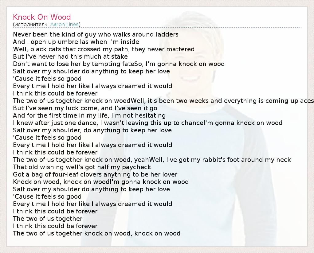 Never been the kind of guy who walks around ladders And I open up umbrellas when I'm inside Well, black cats that crossed my path, they never mattered But I've never had this much at stake Don't want to lose her by tempting fateSo, I'm gonna knock on wood Salt over my shoulder do anything to keep her love 'Cause it feels so good Every time I hold her like I always dreamed it would I think this could be forever The two of us together knock on woodWell, it's been two weeks and everything is coming up aces But I've seen my luck come, and I've seen it go And for the first time in my life, I'm not hesitating I knew after just one dance, I wasn't leaving this up to chanceI'm gonna knock on wood Salt over my shoulder, do anything to keep her love 'Cause it feels so good Every time I hold her like I always dreamed it would I think this could be forever The two of us together knock on wood, yeahWell, I've got my rabbit's foot around my neck That old wishing well's got half my paycheck Got a bag of four-leaf clovers anything to be her lover Knock on wood, knock on woodI'm gonna knock on wood Salt over my shoulder do anything to keep her love 'Cause it feels so good Every time I hold her like I always dreamed it would I think this could be forever The two of us together I think this could be forever The two of us together knock on wood, knock on wood