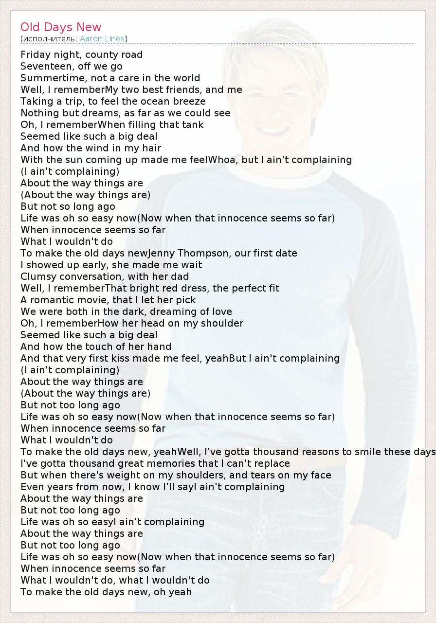 Friday night, county road Seventeen, off we go Summertime, not a care in the world Well, I rememberMy two best friends, and me Taking a trip, to feel the ocean breeze Nothing but dreams, as far as we could see Oh, I rememberWhen filling that tank Seemed like such a big deal And how the wind in my hair With the sun coming up made me feelWhoa, but I ain't complaining (I ain't complaining) About the way things are (About the way things are) But not so long ago Life was oh so easy now(Now when that innocence seems so far) When innocence seems so far What I wouldn't do To make the old days newJenny Thompson, our first date I showed up early, she made me wait Clumsy conversation, with her dad Well, I rememberThat bright red dress, the perfect fit A romantic movie, that I let her pick We were both in the dark, dreaming of love Oh, I rememberHow her head on my shoulder Seemed like such a big deal And how the touch of her hand And that very first kiss made me feel, yeahBut I ain't complaining (I ain't complaining) About the way things are (About the way things are) But not too long ago Life was oh so easy now(Now when that innocence seems so far) When innocence seems so far What I wouldn't do To make the old days new, yeahWell, I've gotta thousand reasons to smile these days I've gotta thousand great memories that I can't replace But when there's weight on my shoulders, and tears on my face Even years from now, I know I'll sayI ain't complaining About the way things are But not too long ago Life was oh so easyI ain't complaining About the way things are But not too long ago Life was oh so easy now(Now when that innocence seems so far) When innocence seems so far What I wouldn't do, what I wouldn't do To make the old days new, oh yeah