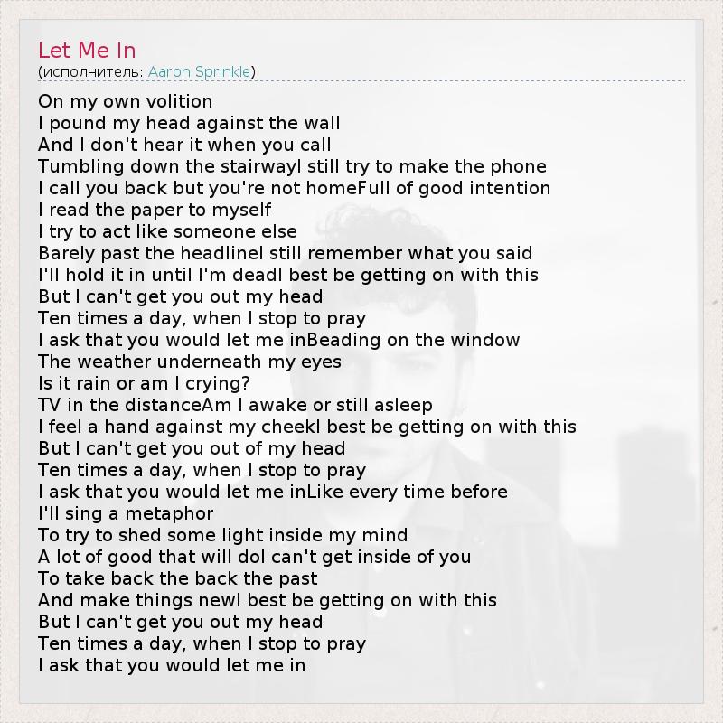 On my own volition I pound my head against the wall And I don't hear it when you call Tumbling down the stairwayI still try to make the phone I call you back but you're not homeFull of good intention I read the paper to myself I try to act like someone else Barely past the headlineI still remember what you said I'll hold it in until I'm deadI best be getting on with this But I can't get you out my head Ten times a day, when I stop to pray I ask that you would let me inBeading on the window The weather underneath my eyes Is it rain or am I crying? TV in the distanceAm I awake or still asleep I feel a hand against my cheekI best be getting on with this But I can't get you out of my head Ten times a day, when I stop to pray I ask that you would let me inLike every time before I'll sing a metaphor To try to shed some light inside my mind A lot of good that will doI can't get inside of you To take back the back the past And make things newI best be getting on with this But I can't get you out my head Ten times a day, when I stop to pray I ask that you would let me in