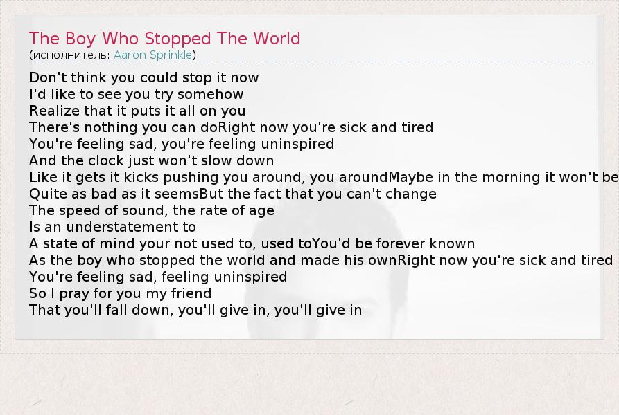 А как ты думаешь, о чем песня "The Boy Who Stopped The World" ?