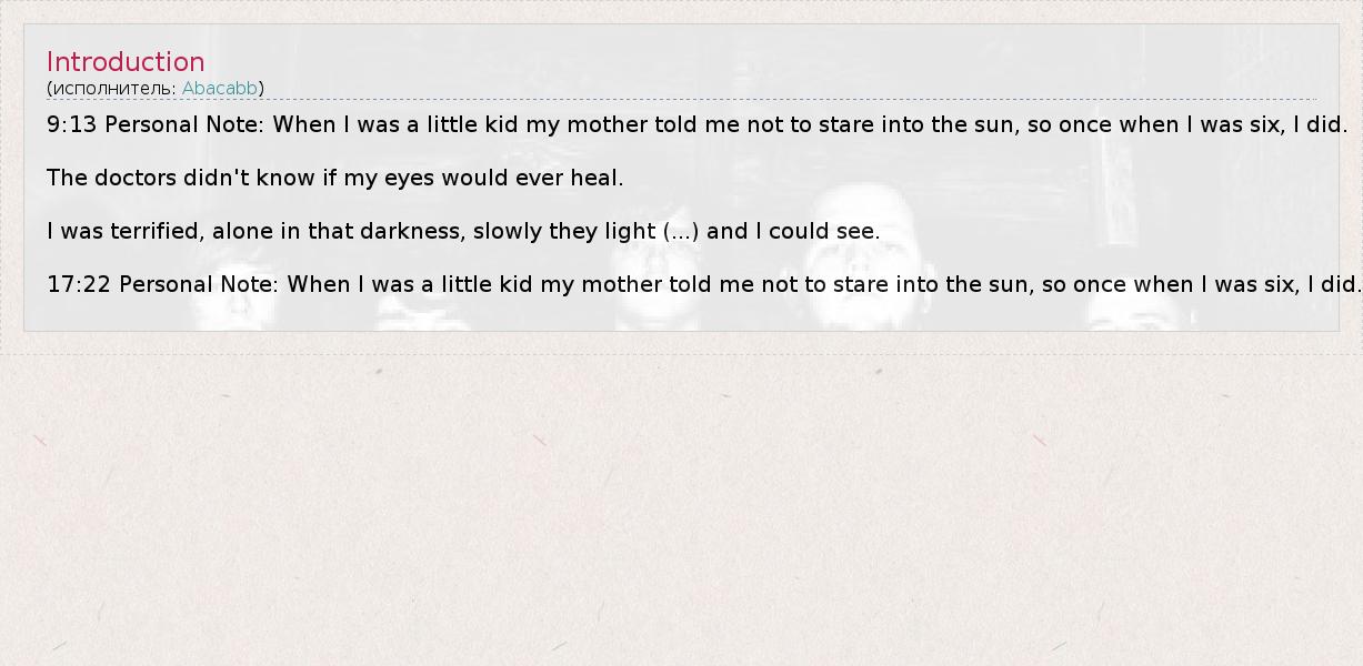 9:13 Personal Note: When I was a little kid my mother told me not to stare into the sun, so once when I was six, I did.