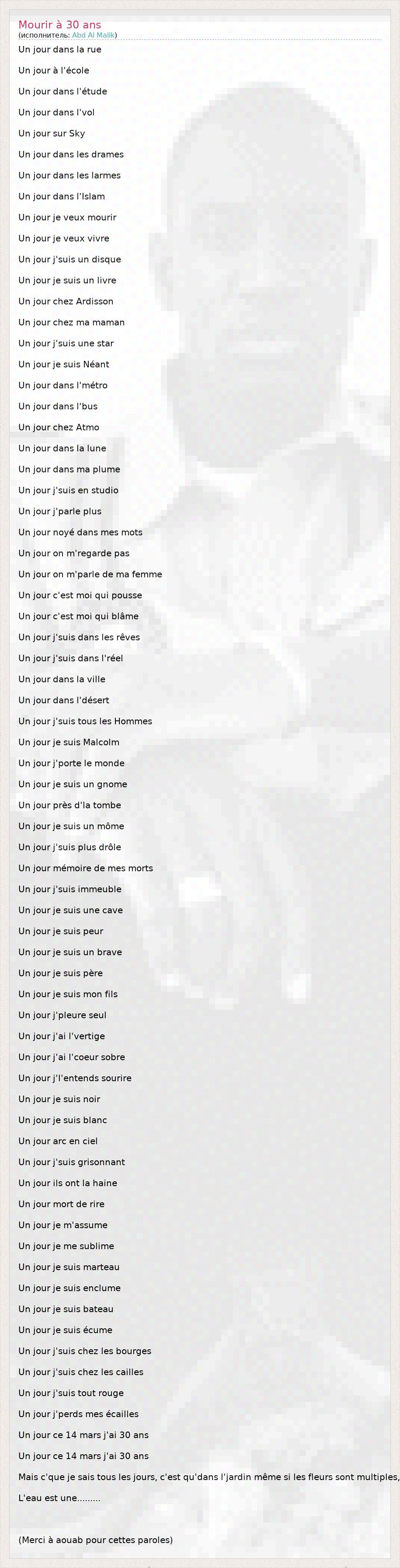 Un jour dans la rue Un jour à l'école Un jour dans l'étude Un jour dans l'vol Un jour sur Sky Un jour dans les drames Un jour dans les larmes Un jour dans l'Islam Un jour je veux mourir Un jour je veux vivre Un jour j'suis un disque Un jour je suis un livre Un jour chez Ardisson Un jour chez ma maman Un jour j'suis une star Un jour je suis Néant Un jour dans l'métro Un jour dans l'bus Un jour chez Atmo Un jour dans la lune Un jour dans ma plume Un jour j'suis en studio Un jour j'parle plus Un jour noyé dans mes mots Un jour on m'regarde pas Un jour on m'parle de ma femme Un jour c'est moi qui pousse Un jour c'est moi qui blâme Un jour j'suis dans les rêves Un jour j'suis dans l'réel Un jour dans la ville Un jour dans l'désert Un jour j'suis tous les Hommes Un jour je suis Malcolm Un jour j'porte le monde Un jour je suis un gnome Un jour près d'la tombe Un jour je suis un môme Un jour j'suis plus drôle Un jour mémoire de mes morts Un jour j'suis immeuble Un jour je suis une cave Un jour je suis peur Un jour je suis un brave Un jour je suis père Un jour je suis mon fils Un jour j'pleure seul Un jour j'ai l'vertige Un jour j'ai l'coeur sobre Un jour j'l'entends sourire Un jour je suis noir Un jour je suis blanc Un jour arc en ciel Un jour j'suis grisonnant Un jour ils ont la haine Un jour mort de rire Un jour je m'assume Un jour je me sublime Un jour je suis marteau Un jour je suis enclume Un jour je suis bateau Un jour je suis écume Un jour j'suis chez les bourges Un jour j'suis chez les cailles Un jour j'suis tout rouge Un jour j'perds mes écailles Un jour ce 14 mars j'ai 30 ans Un jour ce 14 mars j'ai 30 ans Mais c'que je sais tous les jours, c'est qu'dans l'jardin même si les fleurs sont multiples, L'eau est une......... (Merci à aouab pour cettes paroles)
