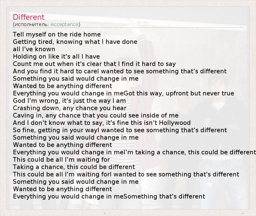 Это интересно:Acceptance - альтернативная рок-группа, образованная в Сиэтле в 1998 году. Их первый EP "Lost for Words" вышел в 2000 году, следующий - "Black Lines to Battlefields" - в 2003. Последняя пластинка "Phantoms" датирована 2005 годом.