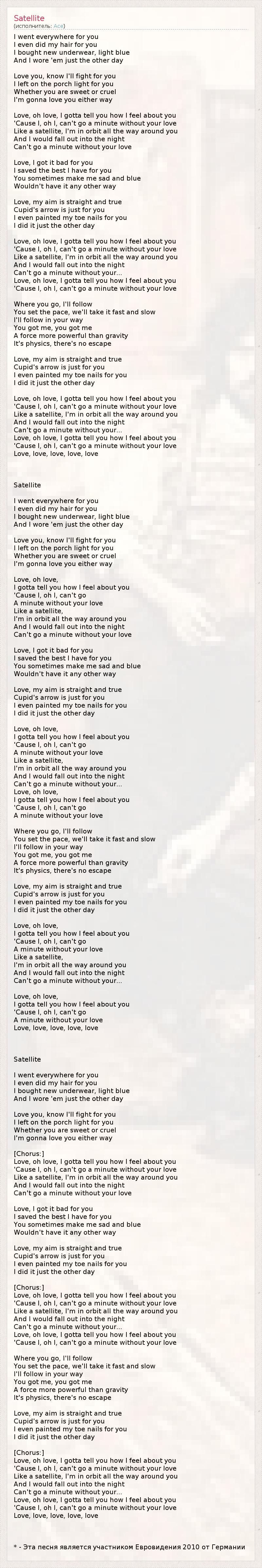 I went everywhere for you I even did my hair for you I bought new underwear, light blue And I wore 'em just the other day Love you, know I'll fight for you I left on the porch light for you Whether you are sweet or cruel I'm gonna love you either way Love, oh love, I gotta tell you how I feel about you 'Cause I, oh I, can't go a minute without your love Like a satellite, I'm in orbit all the way around you And I would fall out into the night Can't go a minute without your love Love, I got it bad for you I saved the best I have for you You sometimes make me sad and blue Wouldn't have it any other way Love, my aim is straight and true Cupid's arrow is just for you I even painted my toe nails for you I did it just the other day Love, oh love, I gotta tell you how I feel about you 'Cause I, oh I, can't go a minute without your love Like a satellite, I'm in orbit all the way around you And I would fall out into the night Can't go a minute without your... Love, oh love, I gotta tell you how I feel about you 'Cause I, oh I, can't go a minute without your love Where you go, I'll follow You set the pace, we'll take it fast and slow I'll follow in your way You got me, you got me A force more powerful than gravity It's physics, there's no escape Love, my aim is straight and true Cupid's arrow is just for you I even painted my toe nails for you I did it just the other day Love, oh love, I gotta tell you how I feel about you 'Cause I, oh I, can't go a minute without your love Like a satellite, I'm in orbit all the way around you And I would fall out into the night Can't go a minute without your... Love, oh love, I gotta tell you how I feel about you 'Cause I, oh I, can't go a minute without your love Love, love, love, love, love Satellite I went everywhere for you I even did my hair for you I bought new underwear, light blue And I wore 'em just the other day Love you, know I'll fight for you I left on the porch light for you Whether you are sweet or cruel I'm gonna love you either way Love, oh love, I gotta tell you how I feel about you 'Cause I, oh I, can't go A minute without your love Like a satellite, I'm in orbit all the way around you And I would fall out into the night Can't go a minute without your love Love, I got it bad for you I saved the best I have for you You sometimes make me sad and blue Wouldn't have it any other way Love, my aim is straight and true Cupid's arrow is just for you I even painted my toe nails for you I did it just the other day Love, oh love, I gotta tell you how I feel about you 'Cause I, oh I, can't go A minute without your love Like a satellite, I'm in orbit all the way around you And I would fall out into the night Can't go a minute without your... Love, oh love, I gotta tell you how I feel about you 'Cause I, oh I, can't go A minute without your love Where you go, I'll follow You set the pace, we'll take it fast and slow I'll follow in your way You got me, you got me A force more powerful than gravity It's physics, there's no escape Love, my aim is straight and true Cupid's arrow is just for you I even painted my toe nails for you I did it just the other day Love, oh love, I gotta tell you how I feel about you 'Cause I, oh I, can't go A minute without your love Like a satellite, I'm in orbit all the way around you And I would fall out into the night Can't go a minute without your... Love, oh love, I gotta tell you how I feel about you 'Cause I, oh I, can't go A minute without your love Love, love, love, love, love Satellite I went everywhere for you I even did my hair for you I bought new underwear, light blue And I wore 'em just the other day Love you, know I'll fight for you I left on the porch light for you Whether you are sweet or cruel I'm gonna love you either way [Chorus:] Love, oh love, I gotta tell you how I feel about you 'Cause I, oh I, can't go a minute without your love Like a satellite, I'm in orbit all the way around you And I would fall out into the night Can't go a minute without your love Love, I got it bad for you I saved the best I have for you You sometimes make me sad and blue Wouldn't have it any other way Love, my aim is straight and true Cupid's arrow is just for you I even painted my toe nails for you I did it just the other day [Chorus:] Love, oh love, I gotta tell you how I feel about you 'Cause I, oh I, can't go a minute without your love Like a satellite, I'm in orbit all the way around you And I would fall out into the night Can't go a minute without your... Love, oh love, I gotta tell you how I feel about you 'Cause I, oh I, can't go a minute without your love Where you go, I'll follow You set the pace, we'll take it fast and slow I'll follow in your way You got me, you got me A force more powerful than gravity It's physics, there's no escape Love, my aim is straight and true Cupid's arrow is just for you I even painted my toe nails for you I did it just the other day [Chorus:] Love, oh love, I gotta tell you how I feel about you 'Cause I, oh I, can't go a minute without your love Like a satellite, I'm in orbit all the way around you And I would fall out into the night Can't go a minute without your... Love, oh love, I gotta tell you how I feel about you 'Cause I, oh I, can't go a minute without your love Love, love, love, love, love * - Эта песня является участником Евровидения 2010 от Германии