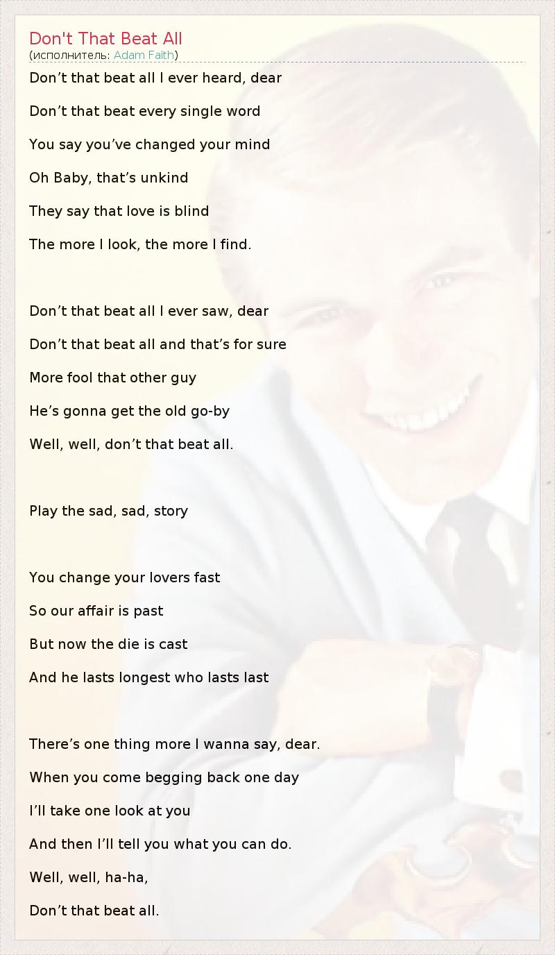 Don’t that beat all I ever heard, dear Don’t that beat every single word You say you’ve changed your mind Oh Baby, that’s unkind They say that love is blind The more I look, the more I find. Don’t that beat all I ever saw, dear Don’t that beat all and that’s for sure More fool that other guy He’s gonna get the old go-by Well, well, don’t that beat all. Play the sad, sad, story You change your lovers fast So our affair is past But now the die is cast And he lasts longest who lasts last There’s one thing more I wanna say, dear. When you come begging back one day I’ll take one look at you And then I’ll tell you what you can do. Well, well, ha-ha, Don’t that beat all.