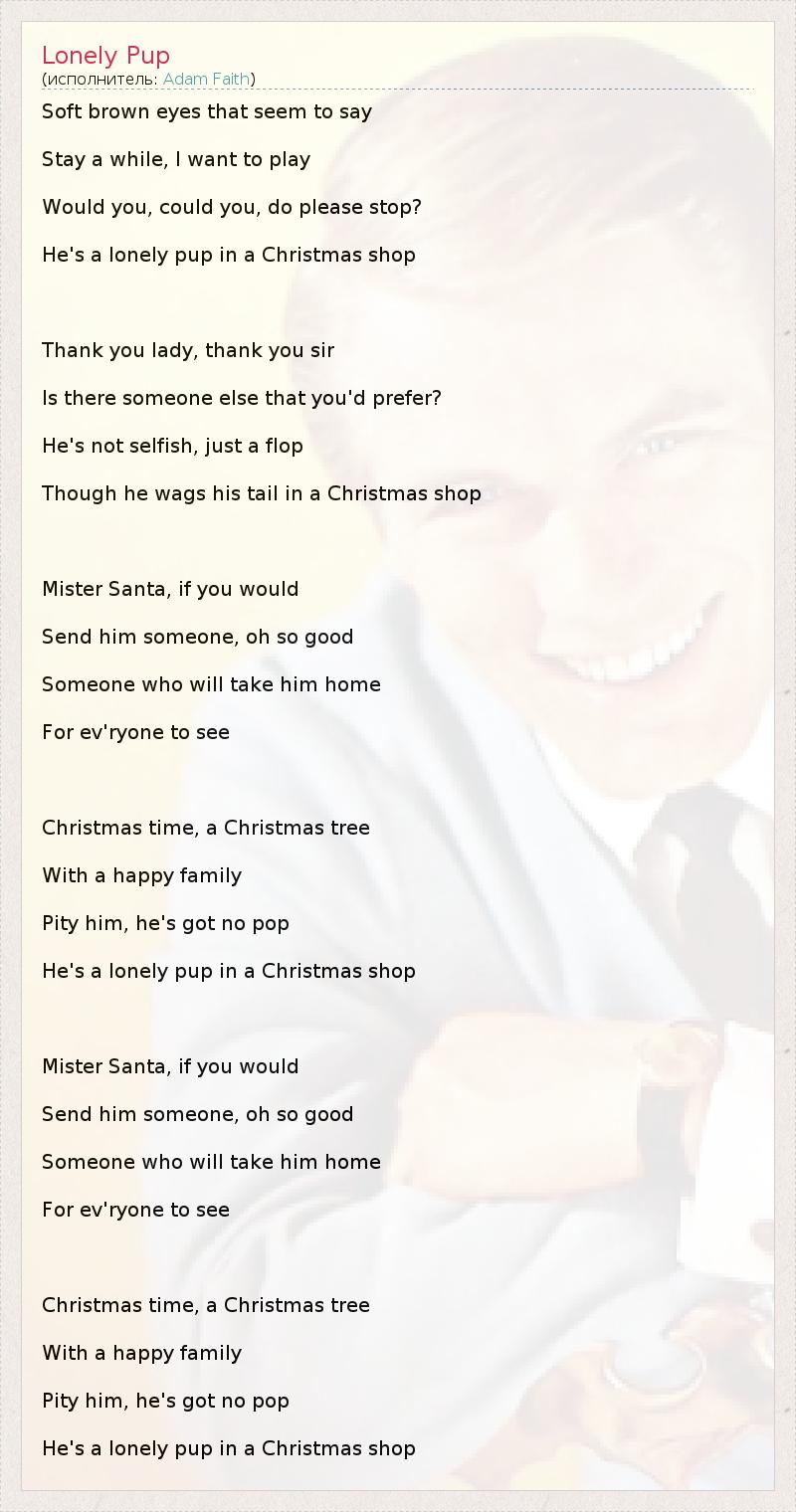 Soft brown eyes that seem to say Stay a while, I want to play Would you, could you, do please stop? He's a lonely pup in a Christmas shop Thank you lady, thank you sir Is there someone else that you'd prefer? He's not selfish, just a flop Though he wags his tail in a Christmas shop Mister Santa, if you would Send him someone, oh so good Someone who will take him home For ev'ryone to see Christmas time, a Christmas tree With a happy family Pity him, he's got no pop He's a lonely pup in a Christmas shop Mister Santa, if you would Send him someone, oh so good Someone who will take him home For ev'ryone to see Christmas time, a Christmas tree With a happy family Pity him, he's got no pop He's a lonely pup in a Christmas shop
