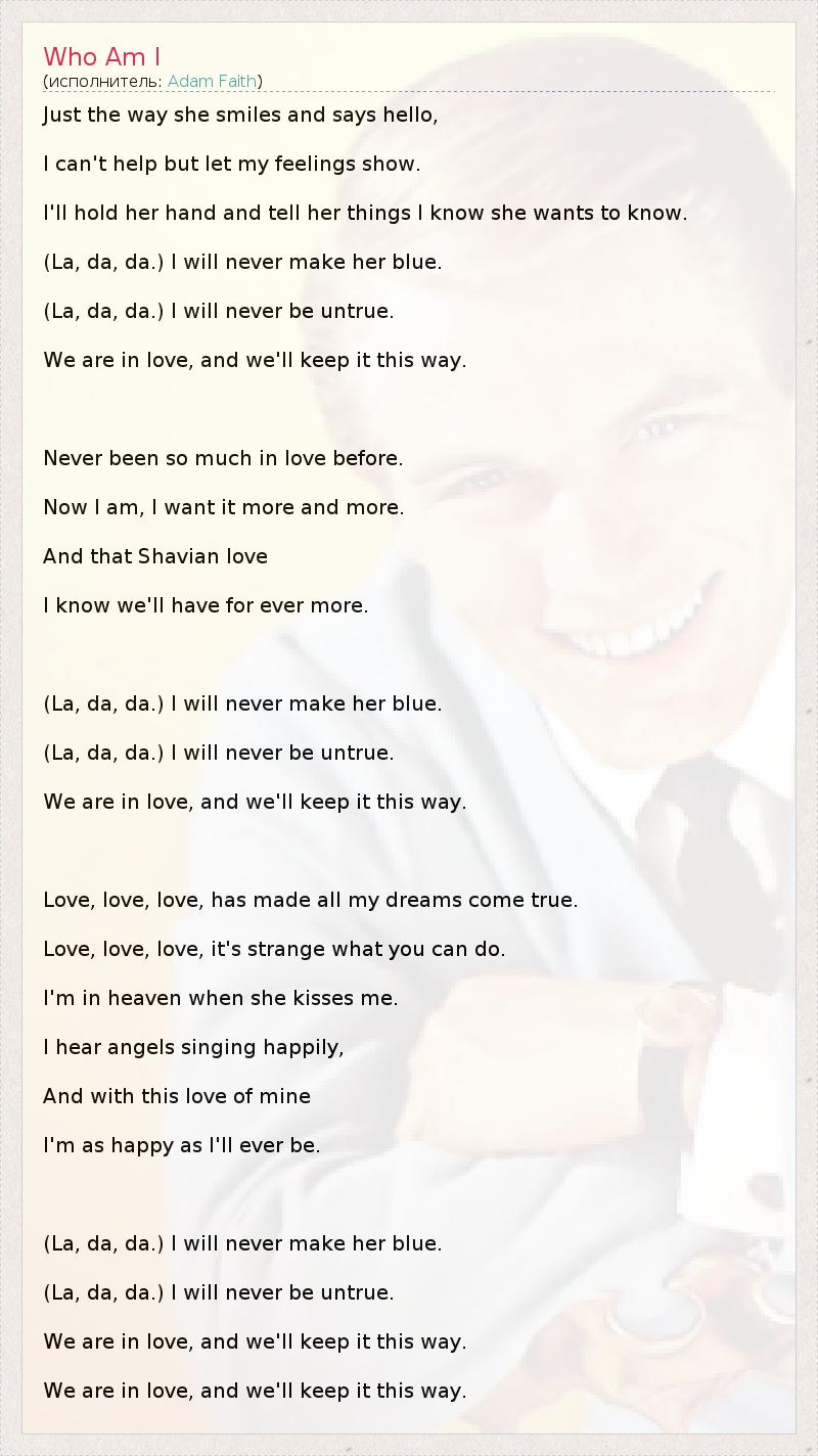 Just the way she smiles and says hello, I can't help but let my feelings show. I'll hold her hand and tell her things I know she wants to know. (La, da, da.) I will never make her blue. (La, da, da.) I will never be untrue. We are in love, and we'll keep it this way. Never been so much in love before. Now I am, I want it more and more. And that Shavian love I know we'll have for ever more. (La, da, da.) I will never make her blue. (La, da, da.) I will never be untrue. We are in love, and we'll keep it this way. Love, love, love, has made all my dreams come true. Love, love, love, it's strange what you can do. I'm in heaven when she kisses me. I hear angels singing happily, And with this love of mine I'm as happy as I'll ever be. (La, da, da.) I will never make her blue. (La, da, da.) I will never be untrue. We are in love, and we'll keep it this way. We are in love, and we'll keep it this way.