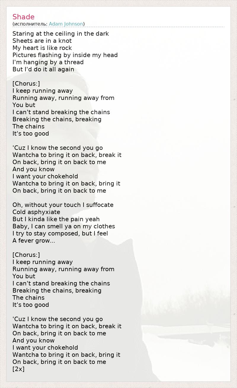 Staring at the ceiling in the dark Sheets are in a knot My heart is like rock Pictures flashing by inside my head I'm hanging by a thread But I'd do it all again [Chorus:] I keep running away Running away, running away from You but I can't stand breaking the chains Breaking the chains, breaking The chains It's too good 'Cuz I know the second you go Wantcha to bring it on back, break it On back, bring it on back to me And you know I want your chokehold Wantcha to bring it on back, bring it On back, bring it on back to me Oh, without your touch I suffocate Cold asphyxiate But I kinda like the pain yeah Baby, I can smell ya on my clothes I try to stay composed, but I feel A fever grow... [Chorus:] I keep running away Running away, running away from You but I can't stand breaking the chains Breaking the chains, breaking The chains It's too good 'Cuz I know the second you go Wantcha to bring it on back, break it On back, bring it on back to me And you know I want your chokehold Wantcha to bring it on back, bring it On back, bring it on back to me [2x]
