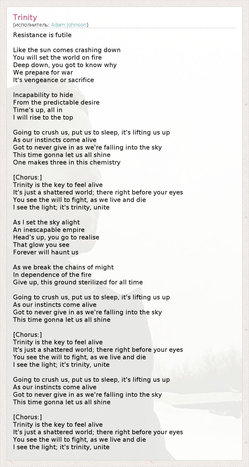 Сопротивление бесполезно. Словно падающее вниз солнце, Ты воспламенишь мир. В глубине души ты должен знать, почему Мы готовимся к войне. Это месть, или жертвоприношение. Невозможно скрыться От предсказуемого желания. Время вышло, ставлю все на кон, Я поднимусь на вершину. Собираясь сокрушить нас и усыпить, это возвышает нас, Наши инстинкты будто просыпаются. Мы никогда не должны сдаваться, когда мы падаем в небо, В этот раз нам позволят проявить себя. В этой химической реакции третий лишний. [Припев:] Троица - это ключ к жизни, Это разрушенный мир прямо перед твоими глазами. Ты видишь волю к борьбе, когда мы на грани жизни и смерти. Я вижу свет, это Троица. Объединяйтесь. Я словно зажигаю небо, Империя неизбежна. Голова поднята, ты идешь, осознавая, Что свет, который ты видишь, Всегда будет преследовать нас. Когда мы сломаем мощные цепи, То окажемся во власти огня. Сдайся, эта земля навеки стерилизована. Собираясь сокрушить нас и усыпить, это возвышает нас, Наши инстинкты будто просыпаются. Мы никогда не должны сдаваться, когда мы падаем в небо, В этот раз нам позволят проявить себя. [Припев:] Троица - это ключ к жизни, Это разрушенный мир прямо перед твоими глазами. Ты видишь волю к борьбе, когда мы на грани жизни и смерти. Я вижу свет, это Троица. Объединяйтесь. Собираясь сокрушить нас и усыпить, это возвышает нас, Наши инстинкты будто просыпаются. Мы никогда не должны сдаваться, когда мы падаем в небо, В этот раз нам позволят проявить себя. [Припев:] Троица - это ключ к жизни, Это разрушенный мир прямо перед твоими глазами. Ты видишь волю к борьбе, когда мы на грани жизни и смерти. Я вижу свет, это Троица. Объединяйтесь.